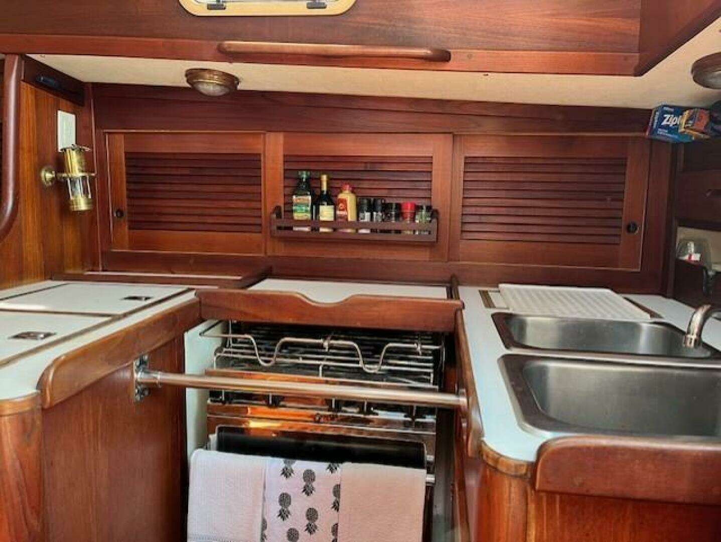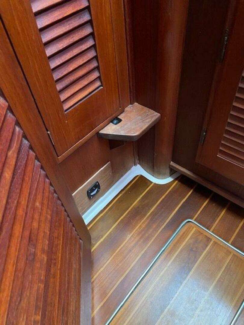Trash Holder – On back of the Galley door under sink there is a teak lip and shelf to secure a plastic trash basket with a lip atop to hold it