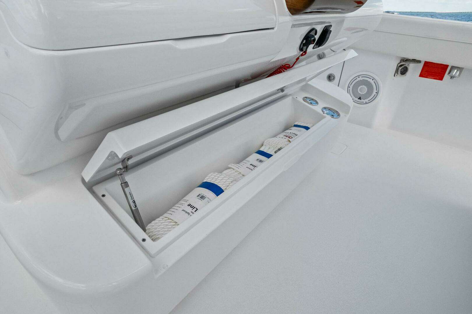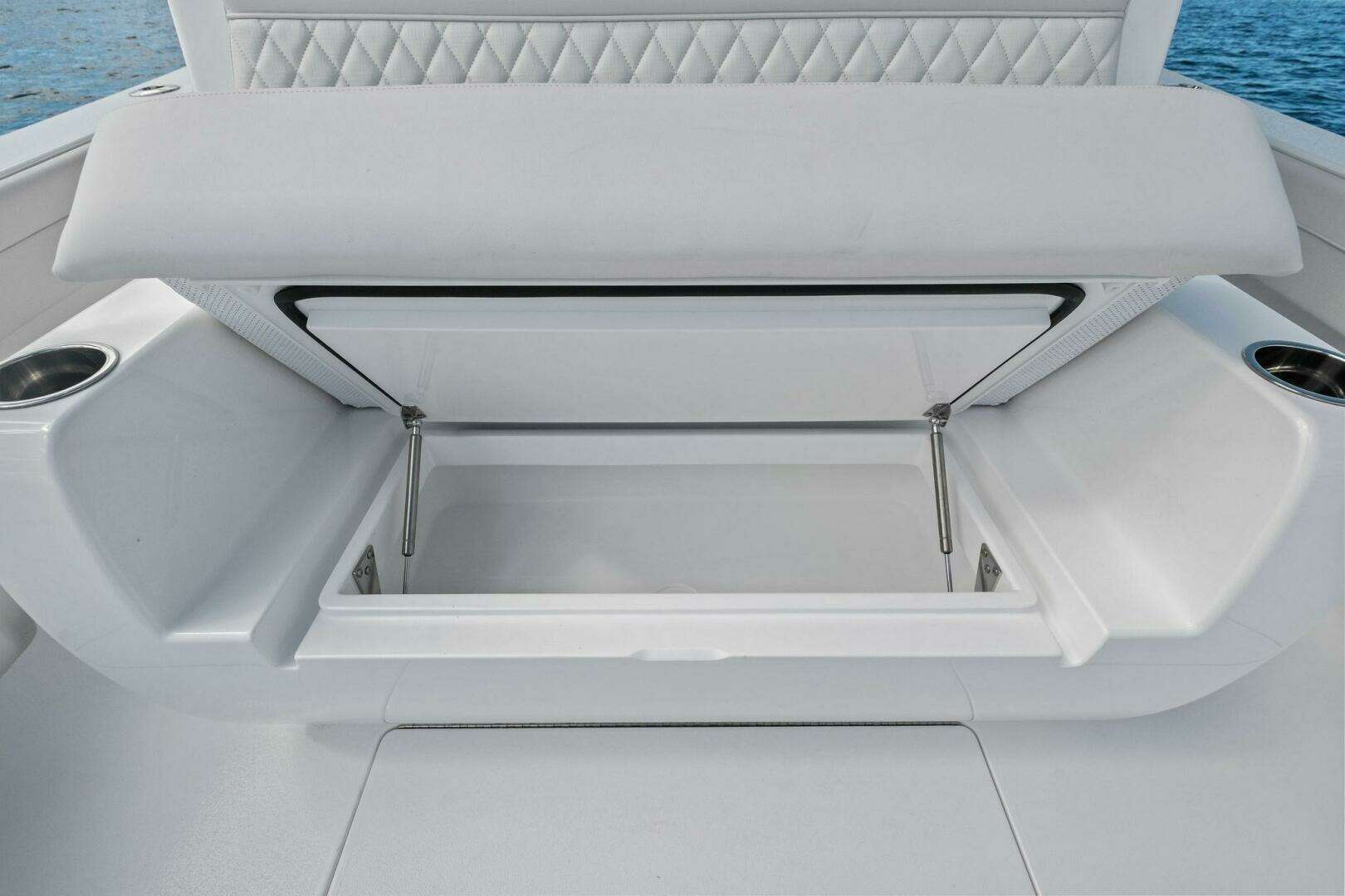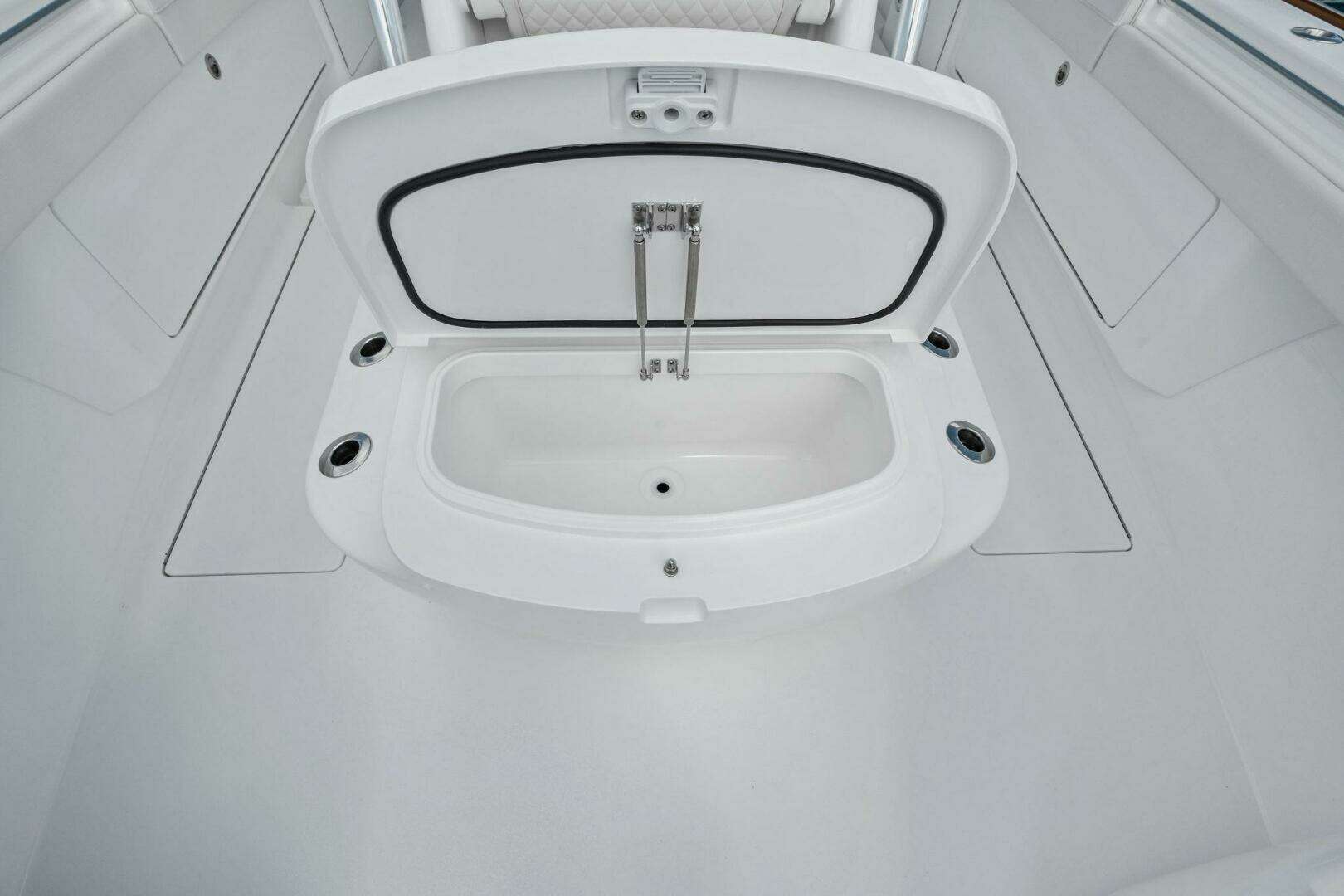 Forward, you’ll find a spacious console lounge, with the option to add port and starboard seating with forward‑facing backrests for unmatched comfort. Inside the console, you'll appreciate convenient access to rod storage, a head and sink, and all critical electronics and systems.