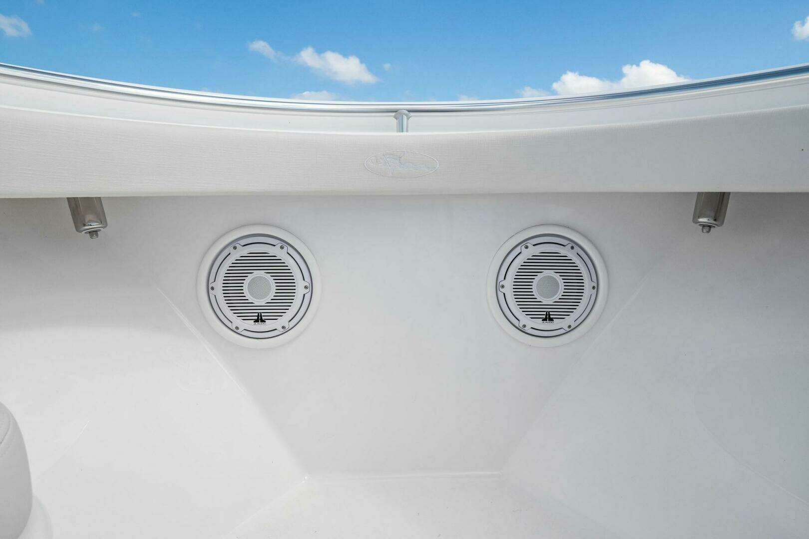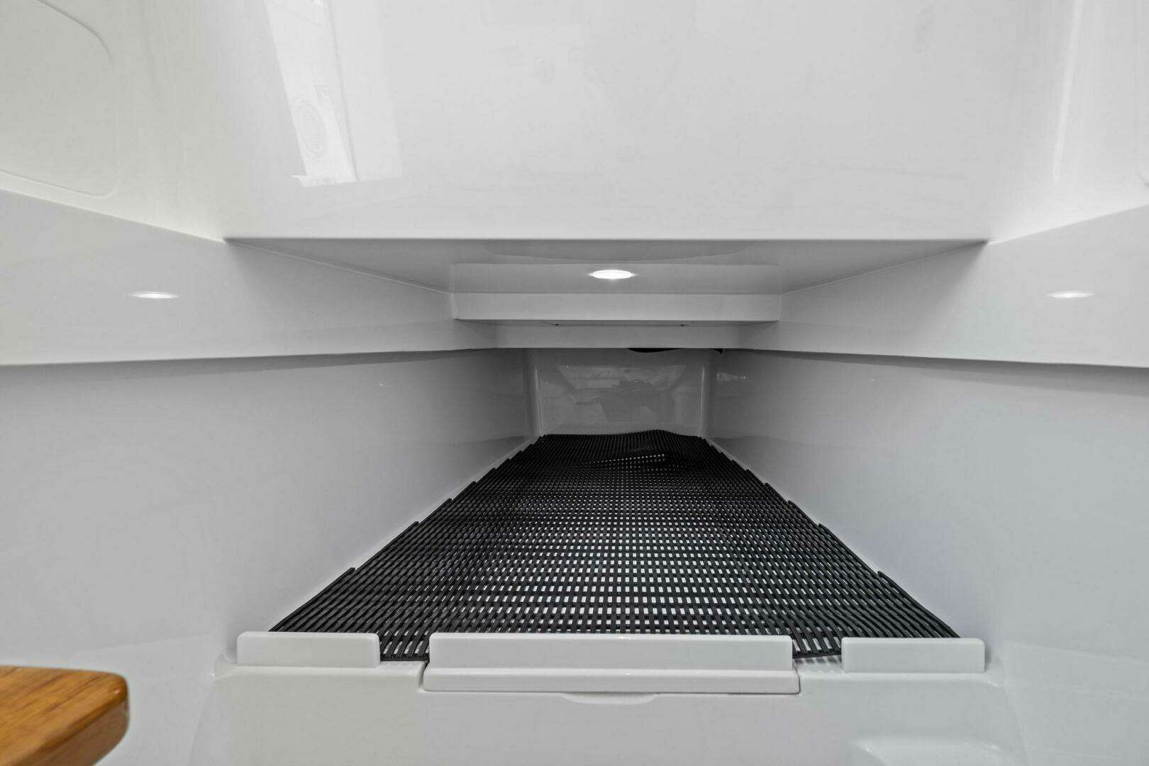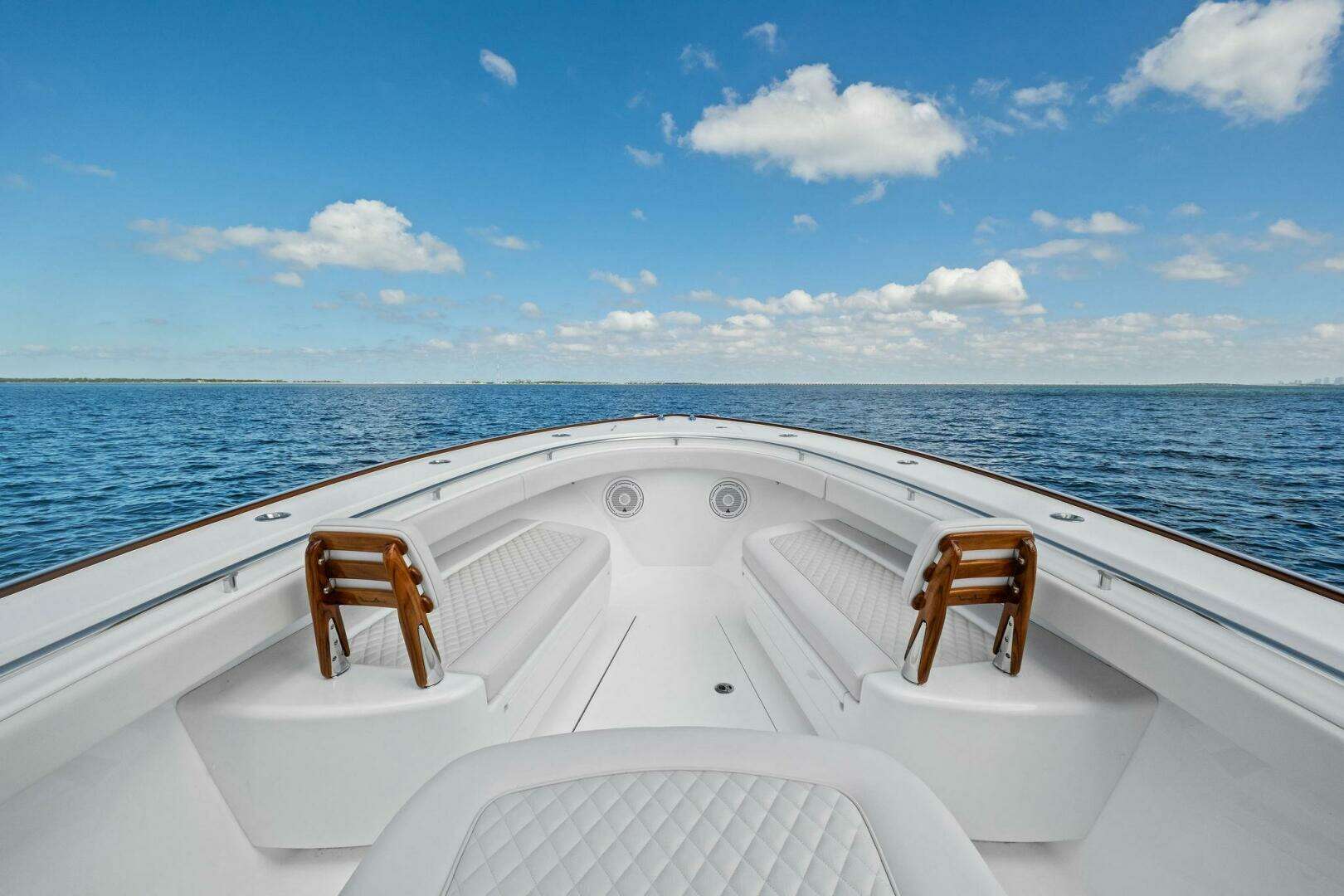 Forward, you’ll find a spacious console lounge, with the option to add port and starboard seating with forward‑facing backrests for unmatched comfort. Inside the console, you'll appreciate convenient access to rod storage, a head and sink, and all critical electronics and systems.