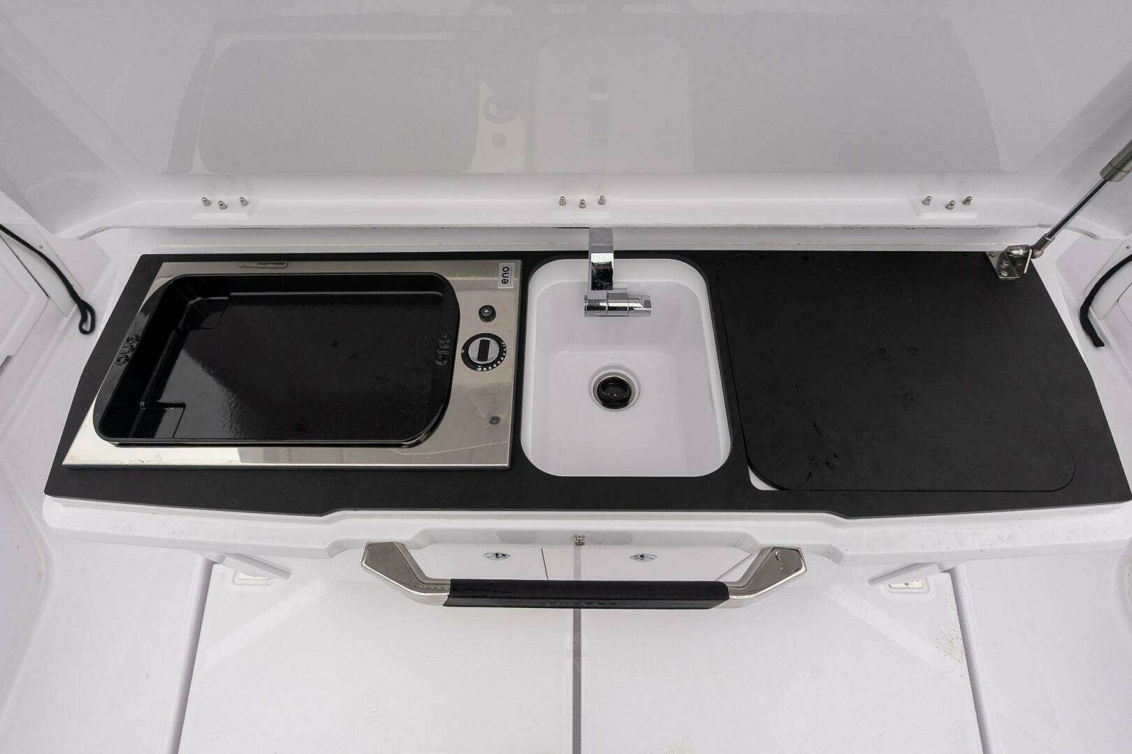 Inside the pilothouse, the layout is designed to maximize connection between interior and exterior spaces. Gullwing doors open the forward cabin to the outdoors for ventilation and easy access to the side decks and bow, while the openable aft pilothouse window connects the cabin with the aft cockpit seating area. A separate head compartment and air conditioning add comfort for extended time aboard.