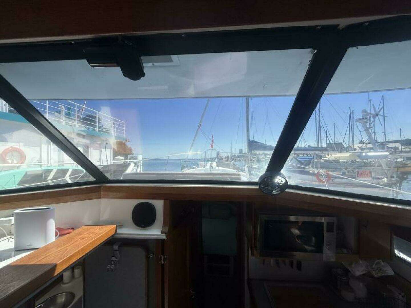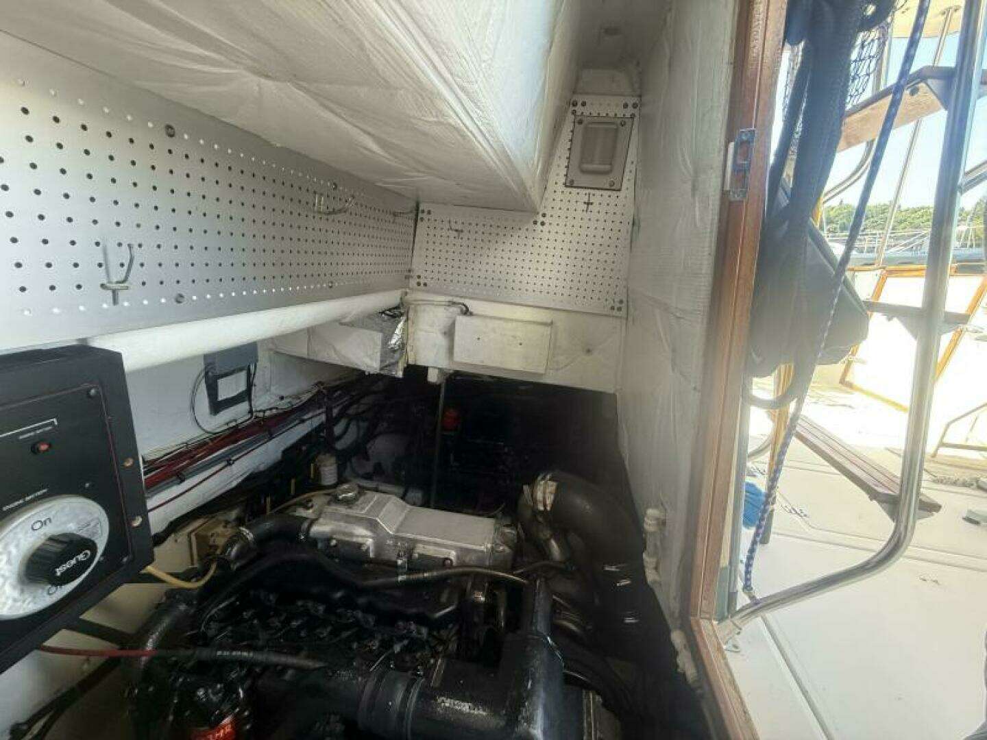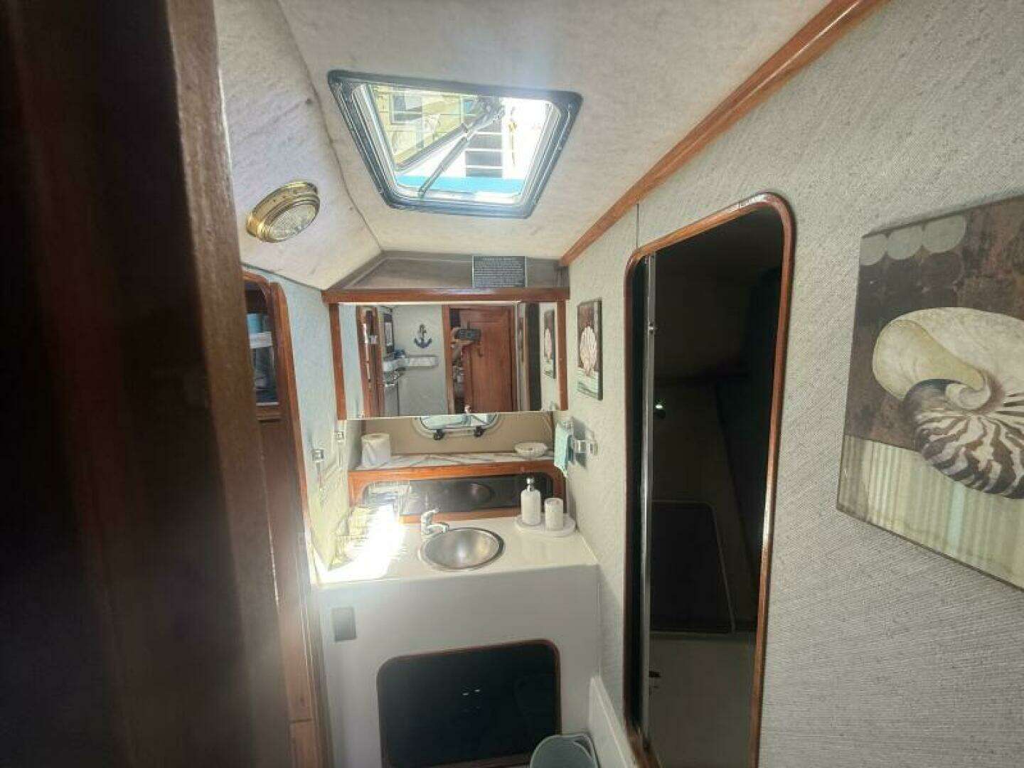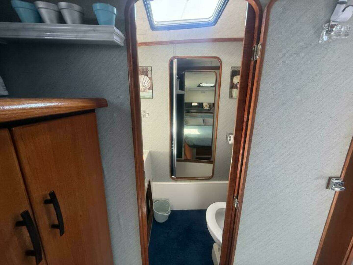 Accommodations include two private staterooms: a forward master with an island berth and ensuite head, and a mid-stateroom with a double berth. The second head features a tub/shower, a rare luxury on a vessel of this size. Warm teak joinery, quality finishes, and a well-maintained interior create a welcoming, home-like atmosphere.