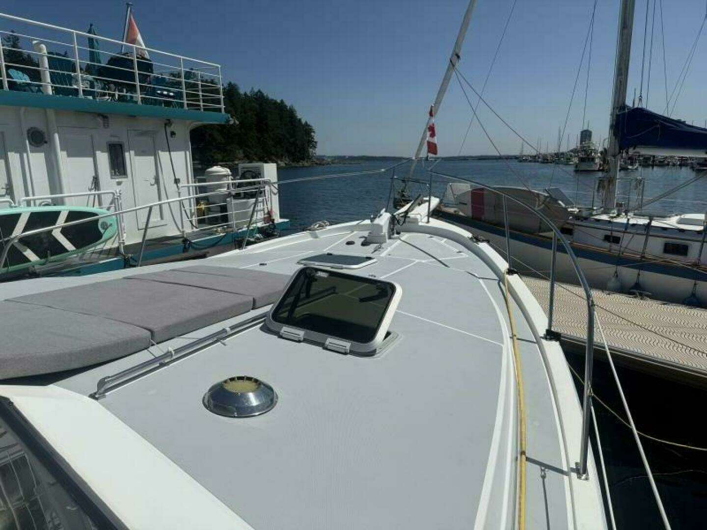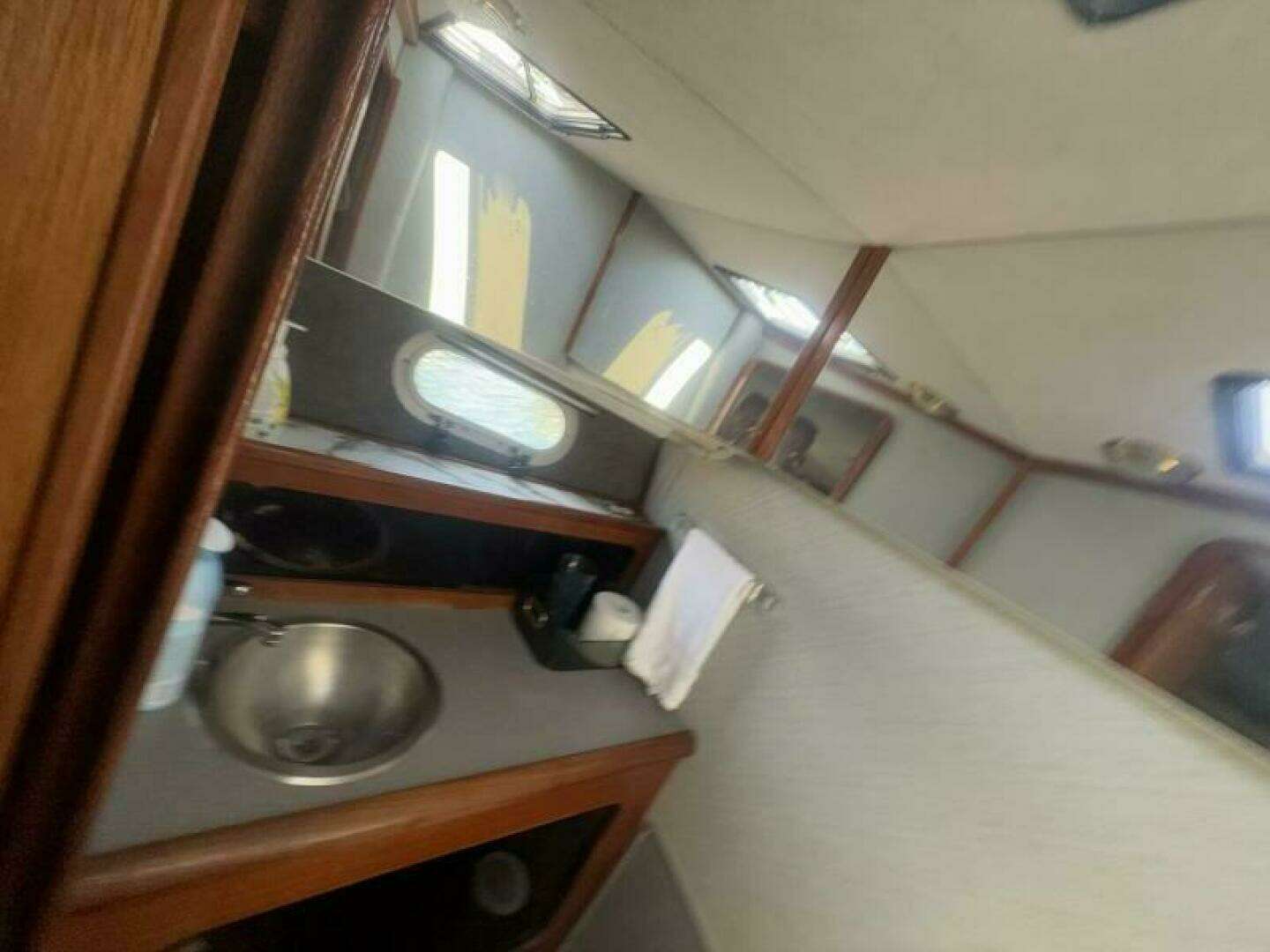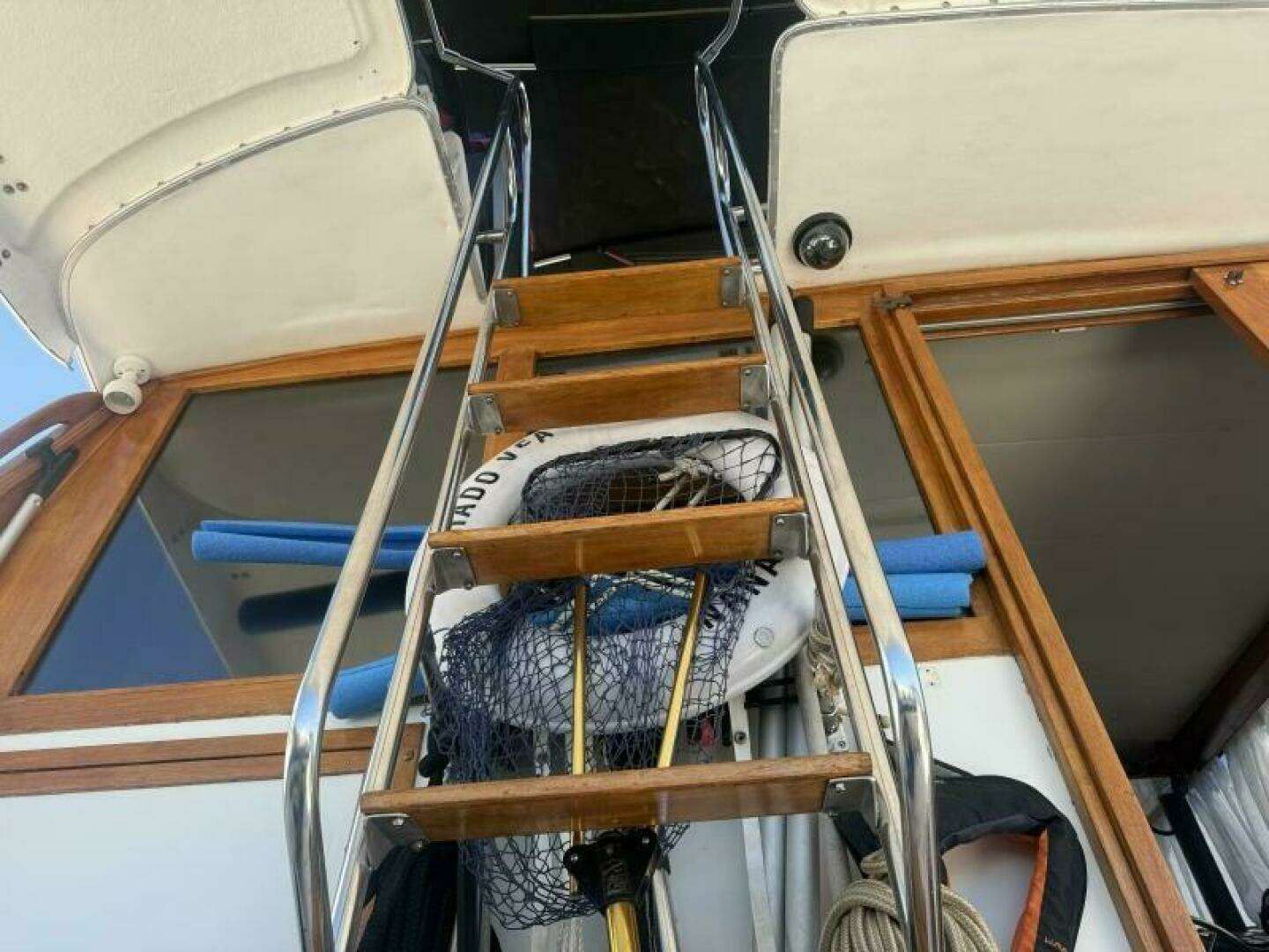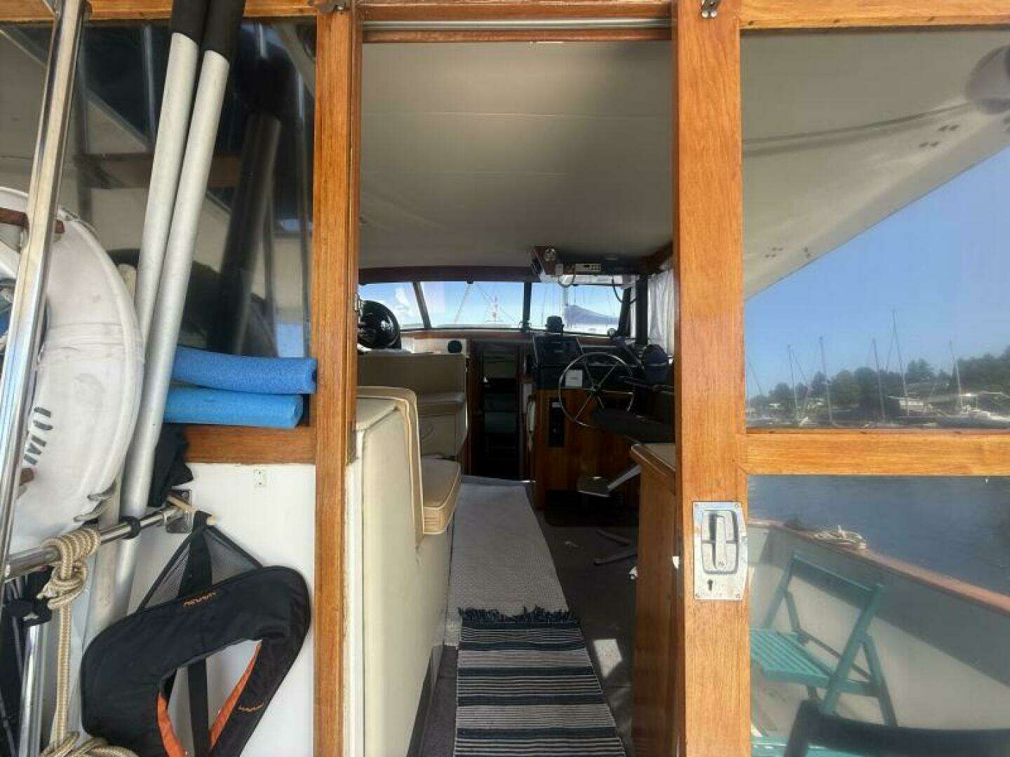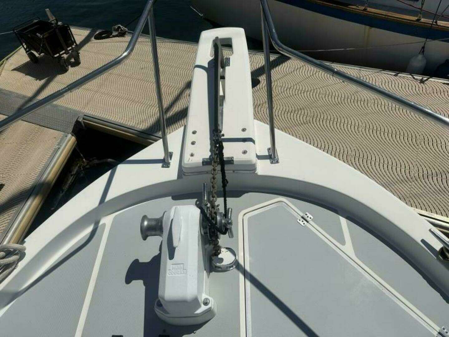 Accommodations include two private staterooms: a forward master with an island berth and ensuite head, and a mid-stateroom with a double berth. The second head features a tub/shower, a rare luxury on a vessel of this size. Warm teak joinery, quality finishes, and a well-maintained interior create a welcoming, home-like atmosphere.
