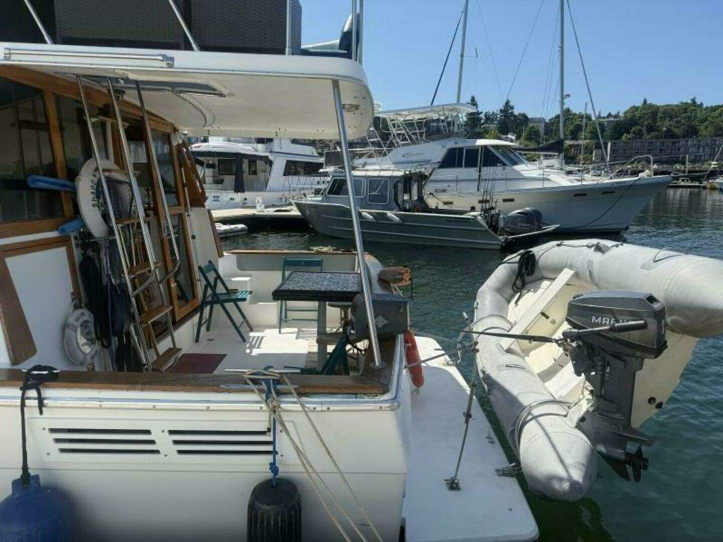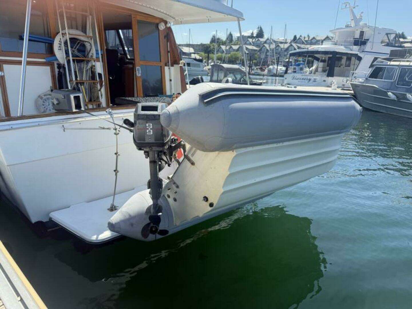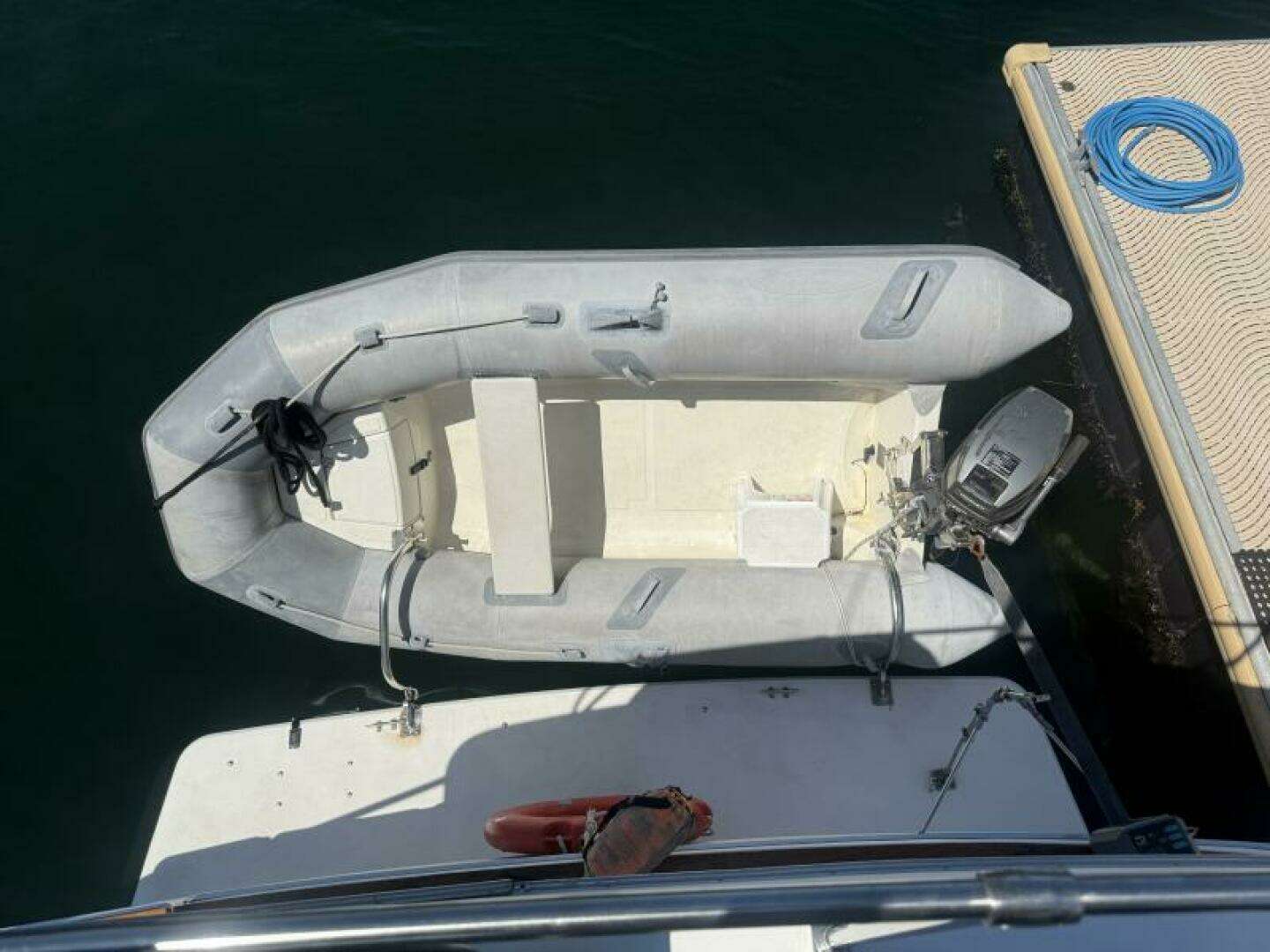 Her equipment list is extensive: Westerbeke 8kW generator, Garmin GPS, Furuno radar, Autohelm autopilot, VHF radios, and a West Marine RIB dinghy with Tohatsu 9.8 HP outboard on a Weaver davit system with electric winch.