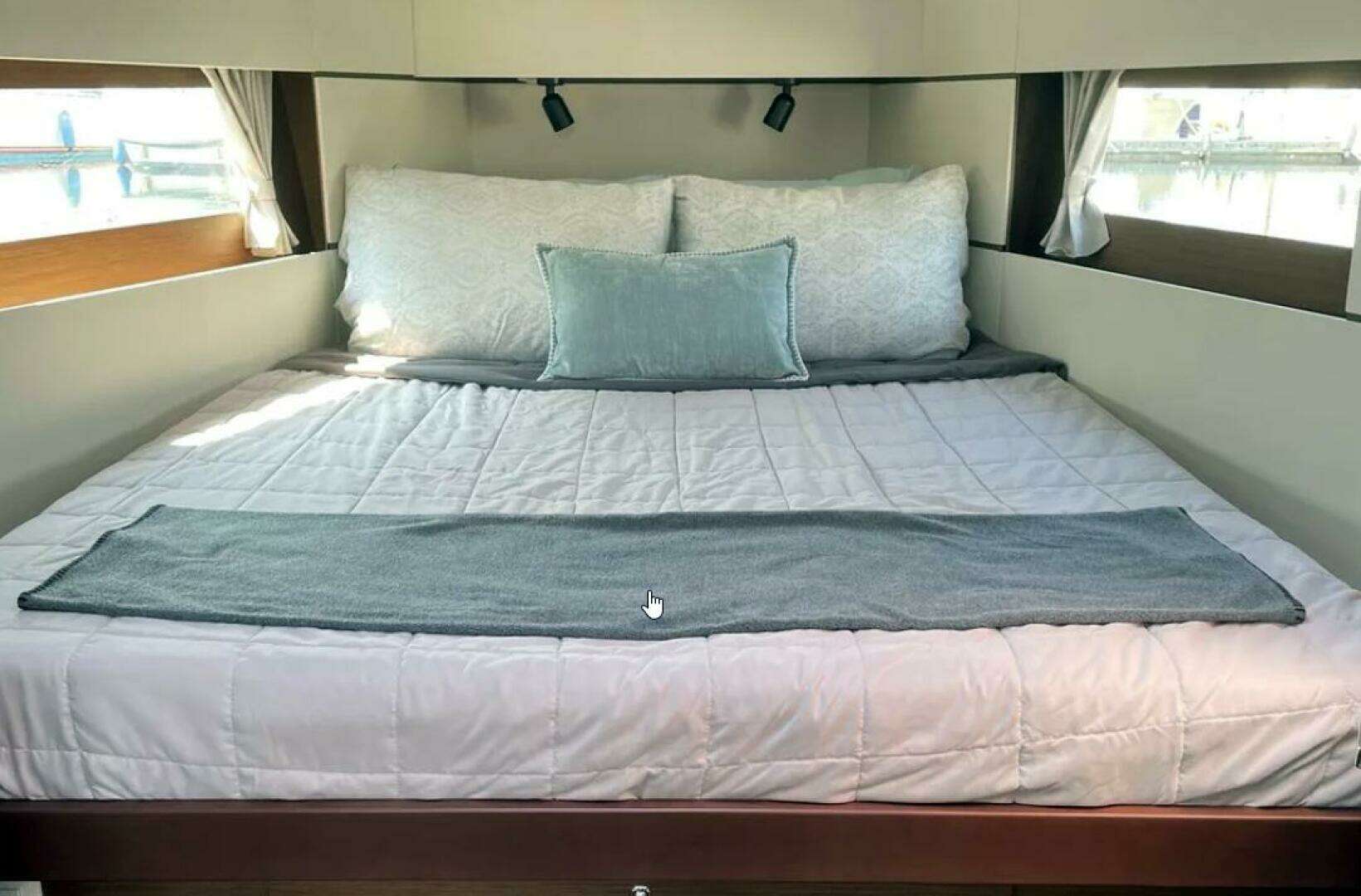 Forward is a large, open cabin with a centerline vee berth berth with 6’5” headroom. There are large hull ports and opening overhead hatch, abundant storage with both a large drawer, and hanging lockers.