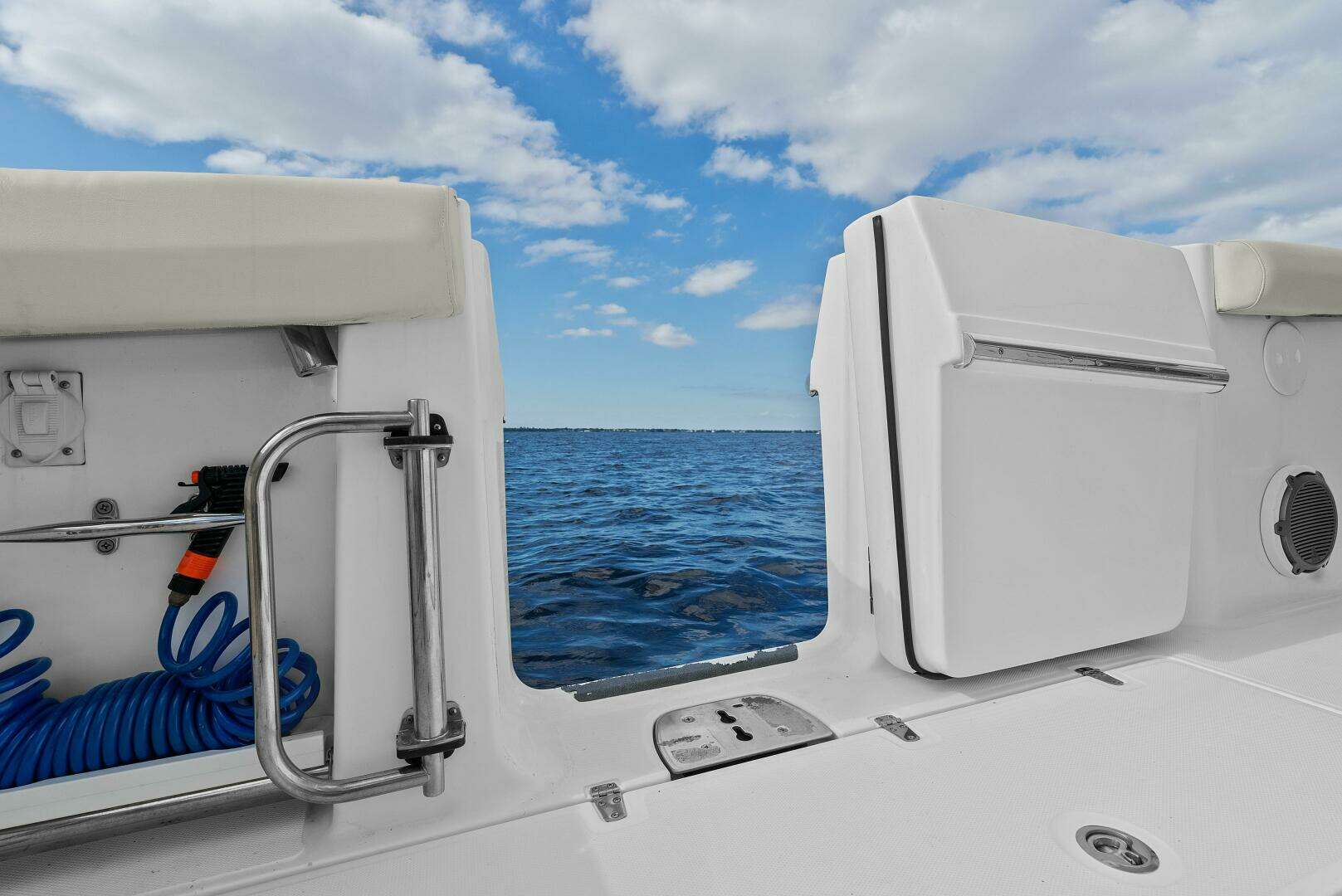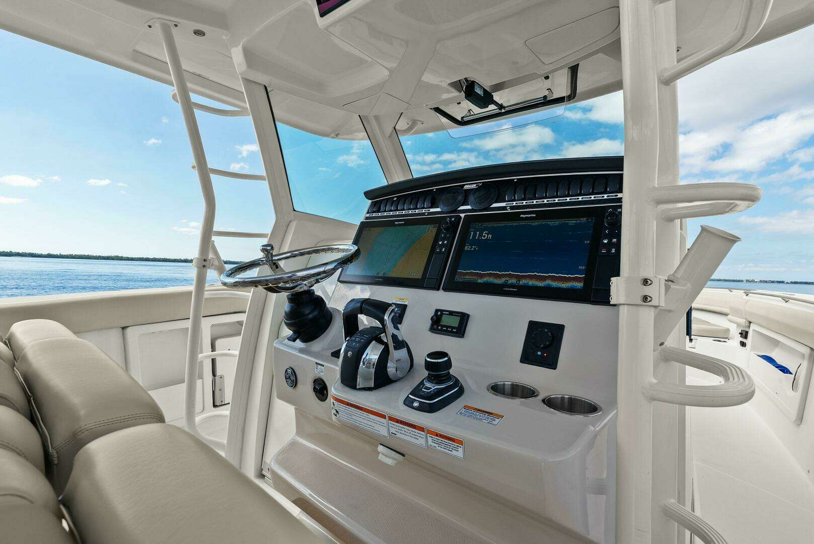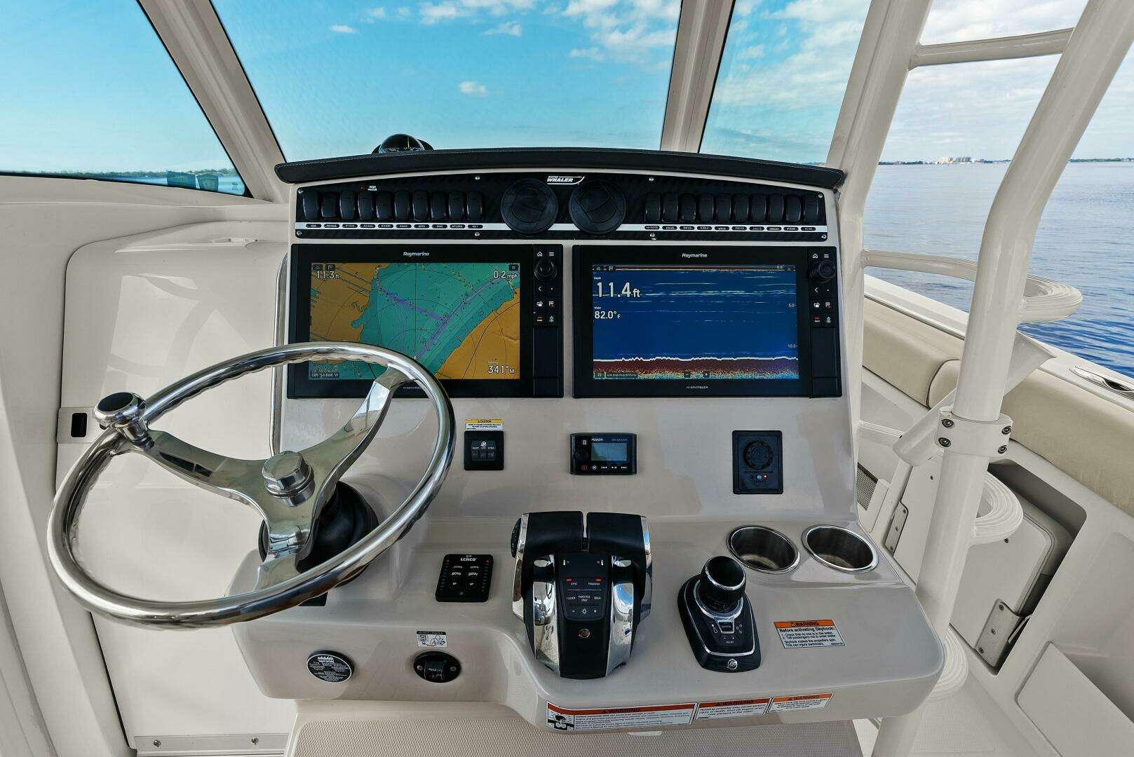 Equipped with premium electronics, including dual Raymarine Axiom 16” displays, a 3D transducer, Raymarine Magnum open array radar, Ray 50 VHF with 8’ antenna, and a Fusion stereo system, you’ll have everything you need for confident navigation and entertainment offshore.