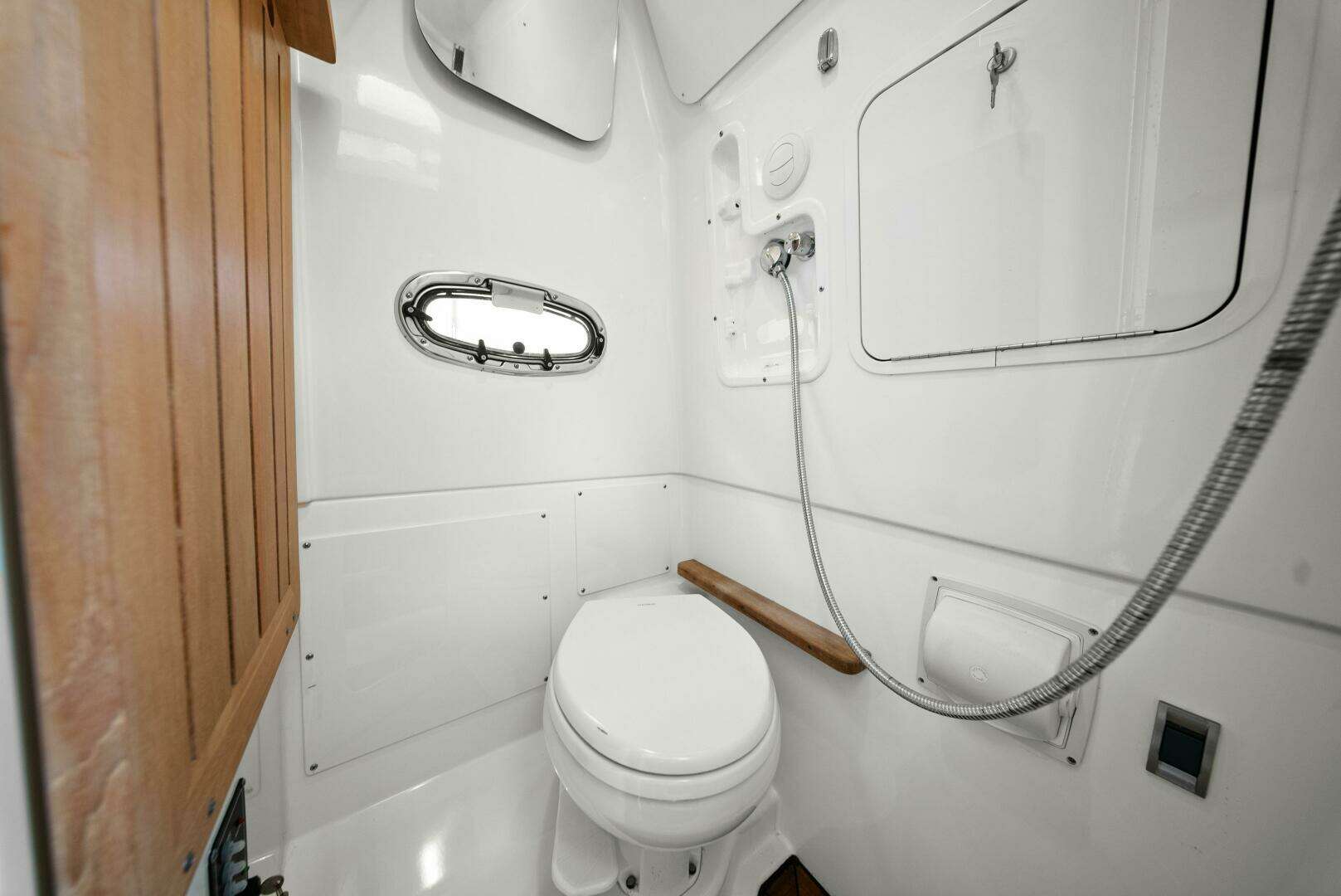 Below deck, the cabin offers impressive amenities for overnight stays, including a convertible berth, rod storage, vanity, and a private shower stall with head.