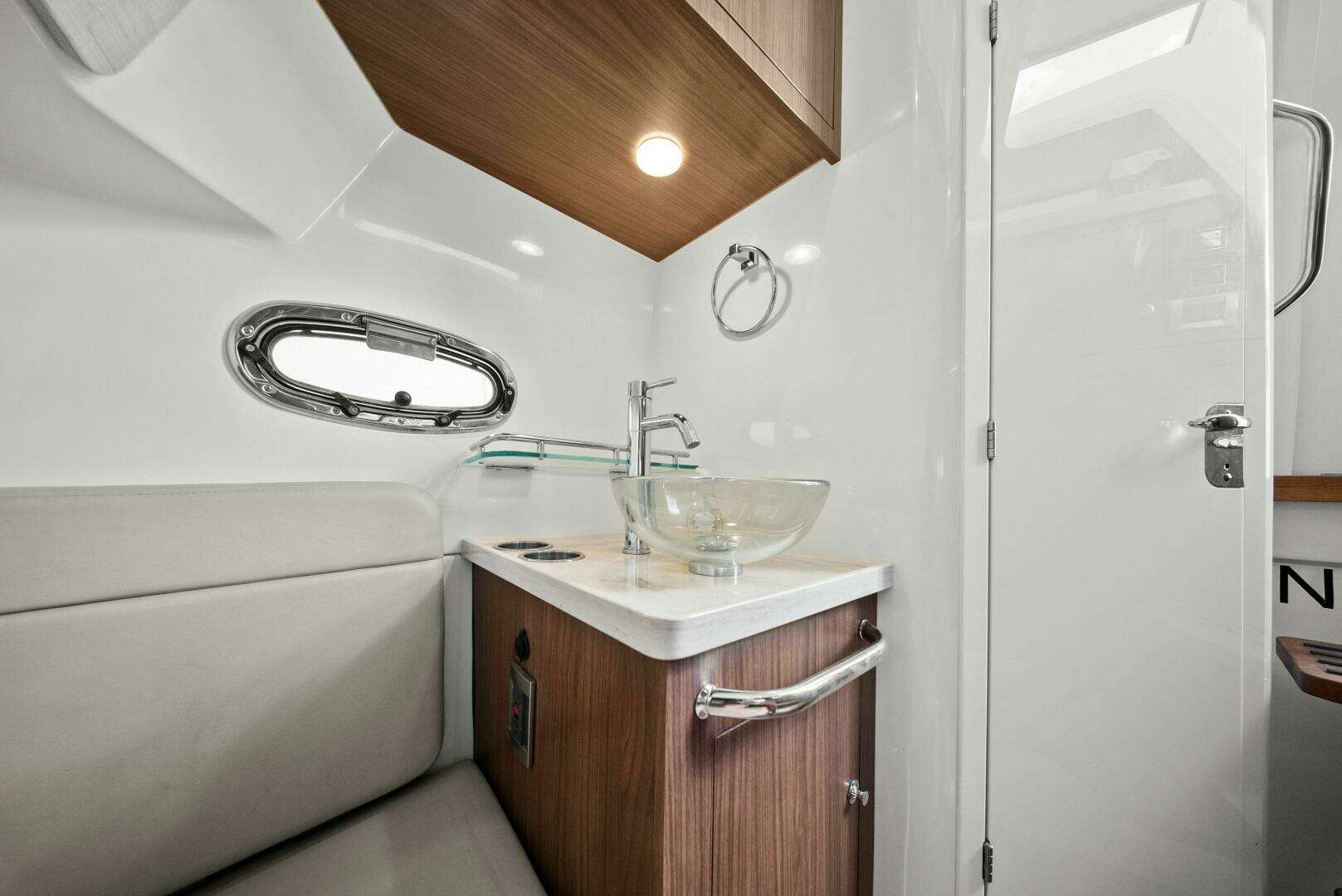 The cockpit is designed with comfort and convenience in mind, featuring a spacious summer kitchen, retractable sunshade, and aft teak tables. The air-conditioned helm provides cooling across all three seats, ensuring comfort even on the warmest days.