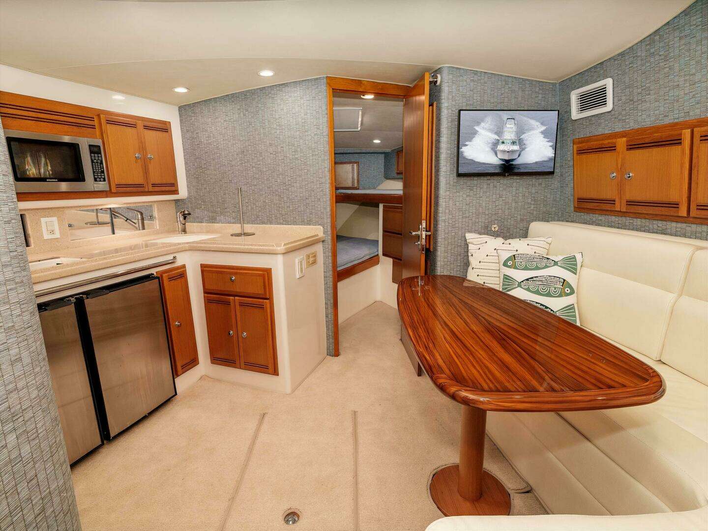 - Double berth w/ wrap-around upper bunks (sleeps 3)