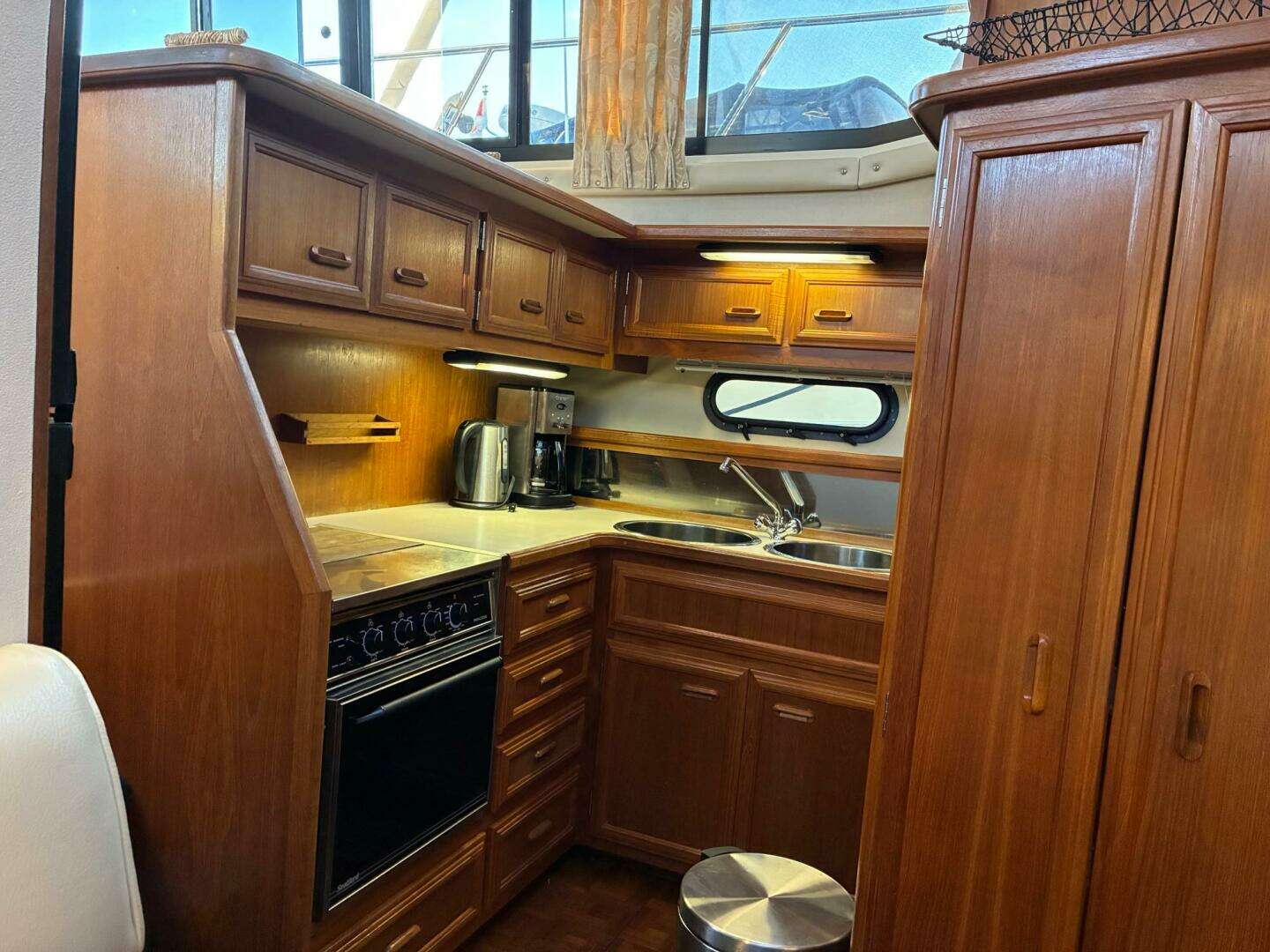 GALLEY: Spacious galley with double basin stainless steel sinks. Opening portlight for ventilation and under-counter lighting.
