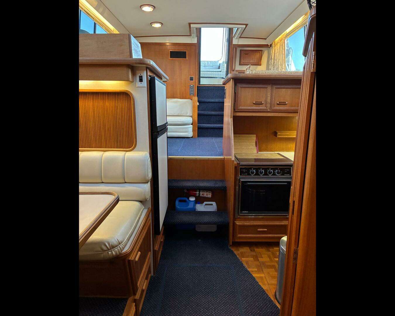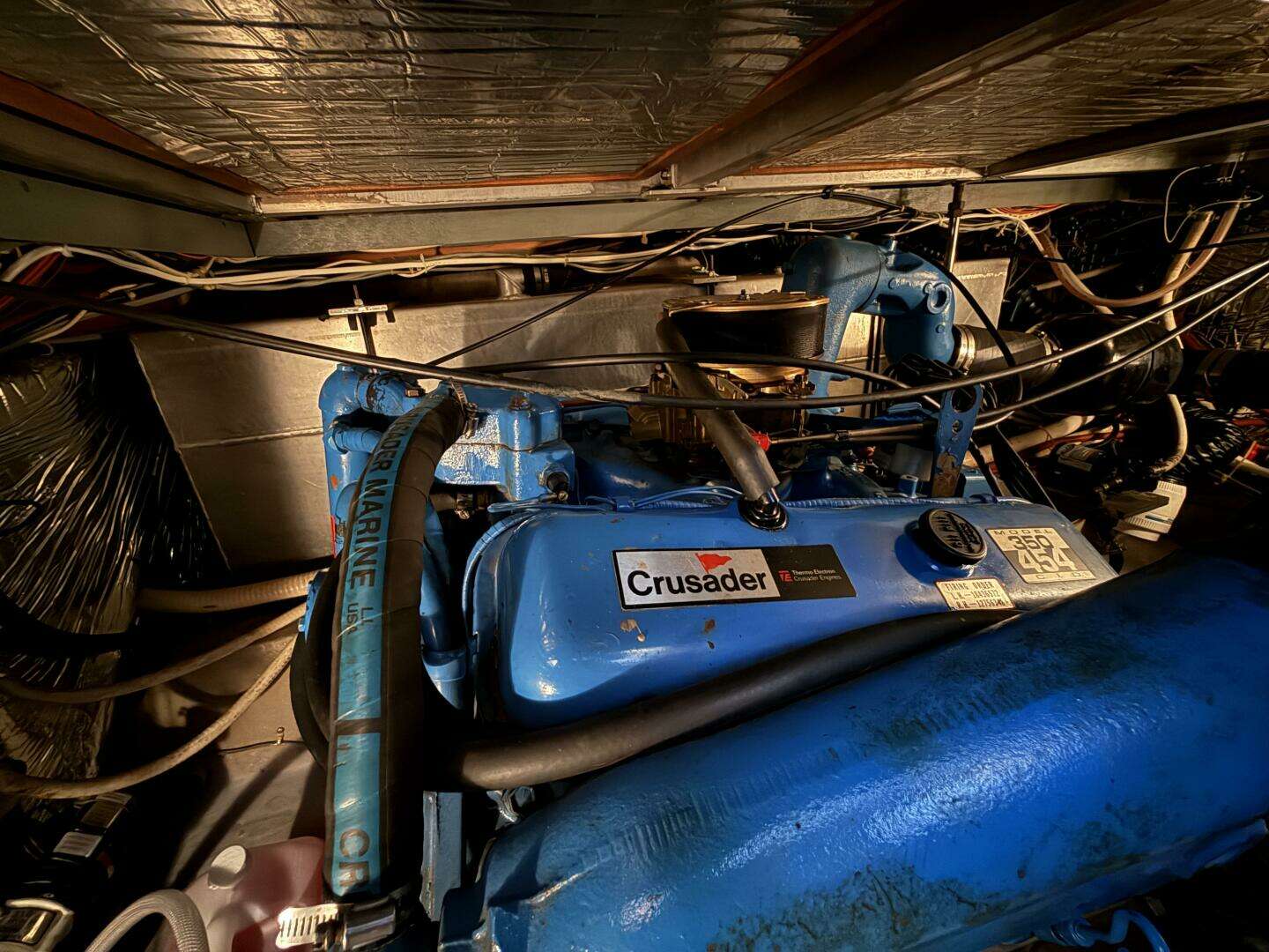 The Carver 38 Aft Cabin features double staterooms with stall showers, a full dinette and galley, a good size aft deck, and a spacious flybridge with forward seating. Known for comfort and layout, it cruises at 14–15 knots with 454 Crusaders and can reach a top speed of 22 knots.