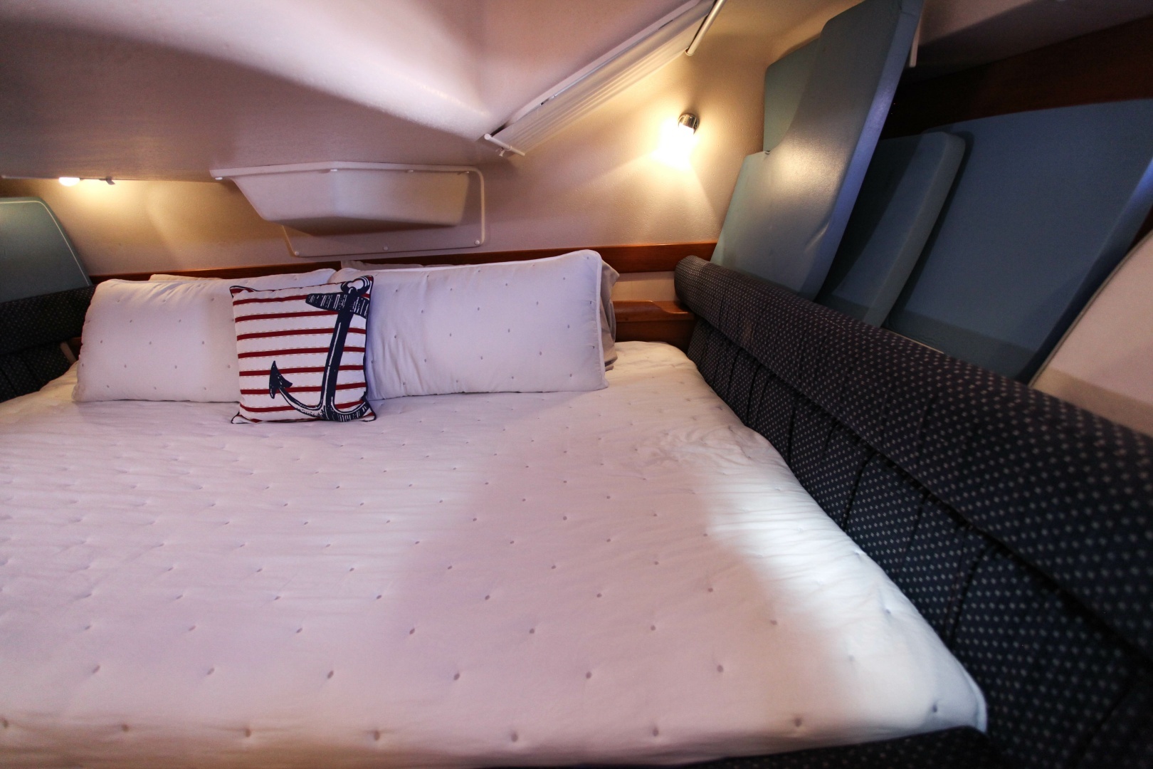 Forward, the guest cabin includes a comfortable V‑berth with drawers and port and starboard lockers for ample storage.