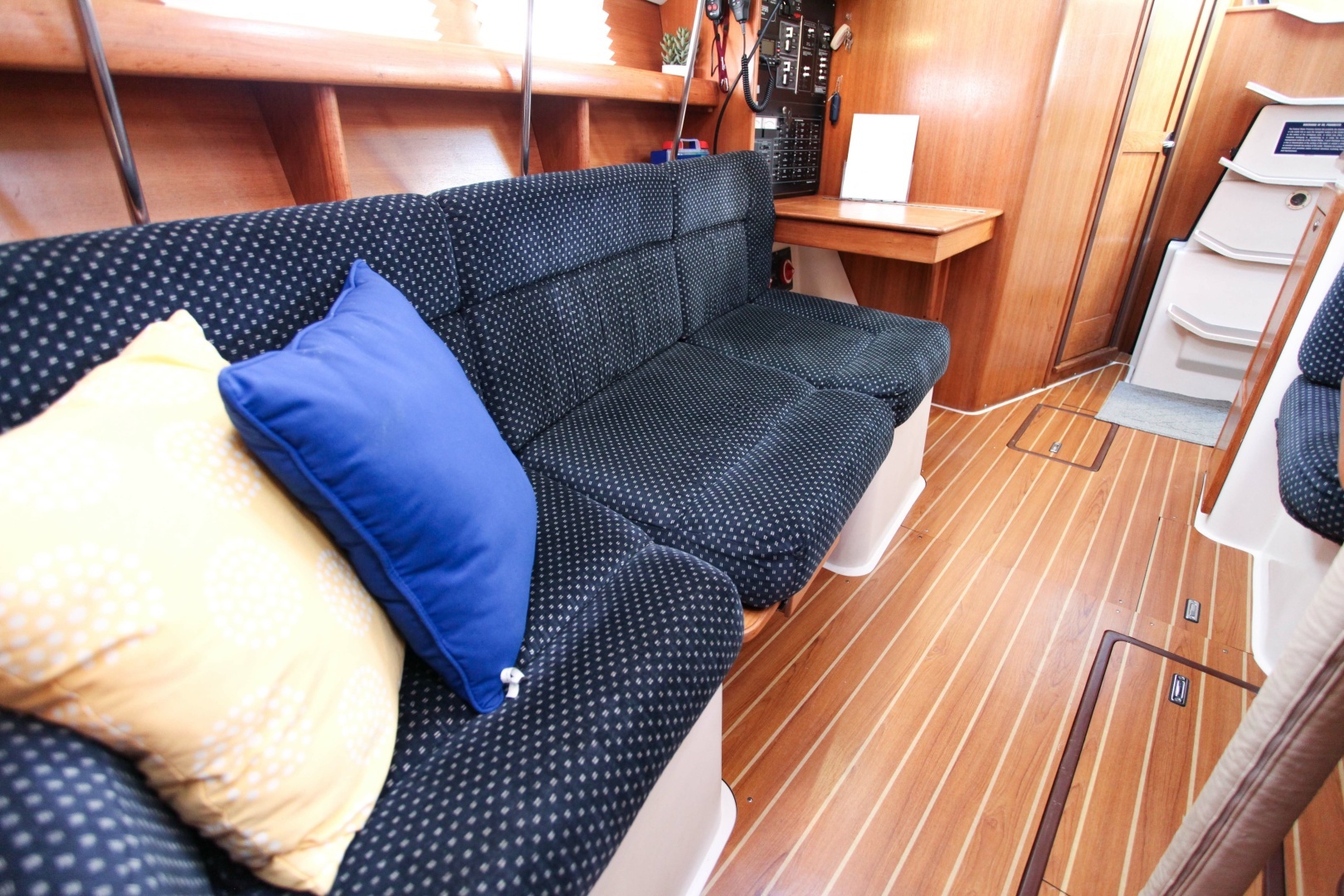 The fully equipped galley is positioned to port, while the navigation station sits opposite to starboard.