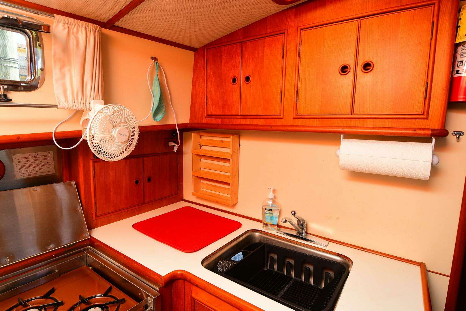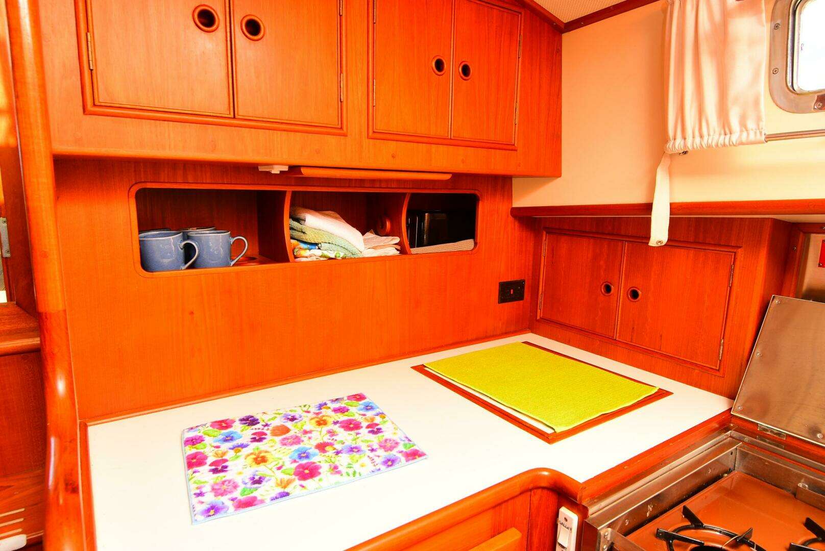 The galley is as functional and attractive as those on much larger yachts, with a gorgeous custom refrigerator, Grunert incounter
