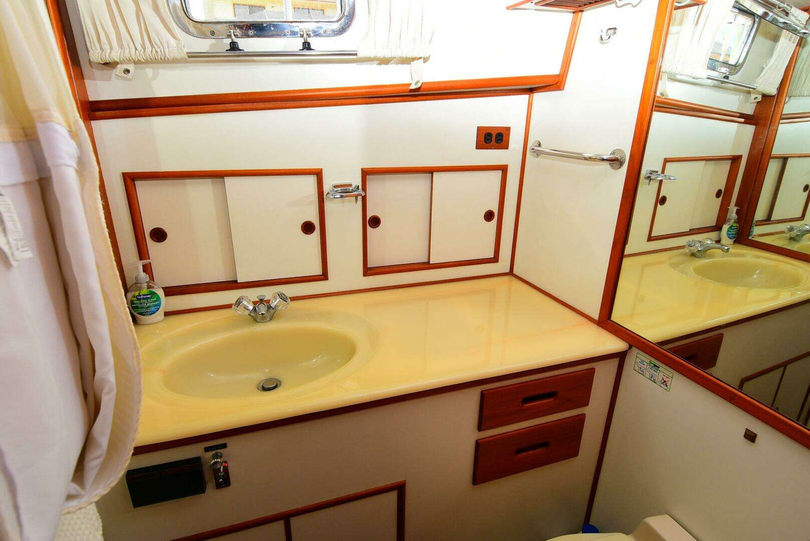 The head is accessed through a sliding, raised panel teak door and includes a VacuFlush fresh water toilet and Sealand