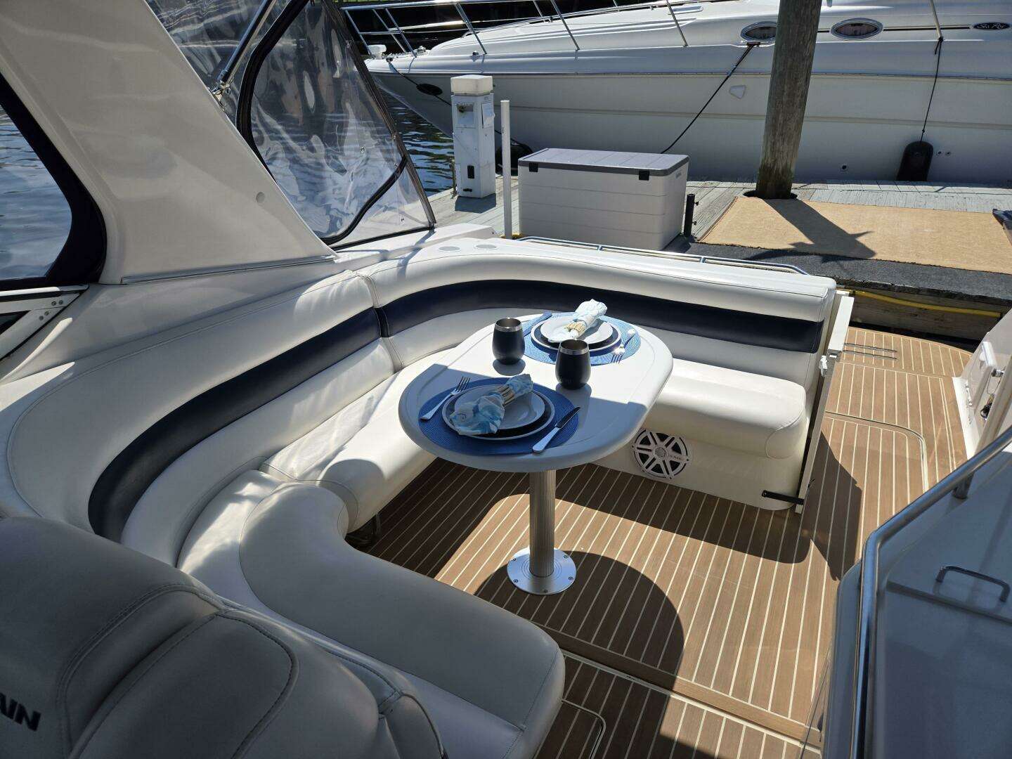 NuTeak custom synthetic flooring throughout cabin, cockpit and swim platform – installed in 2019