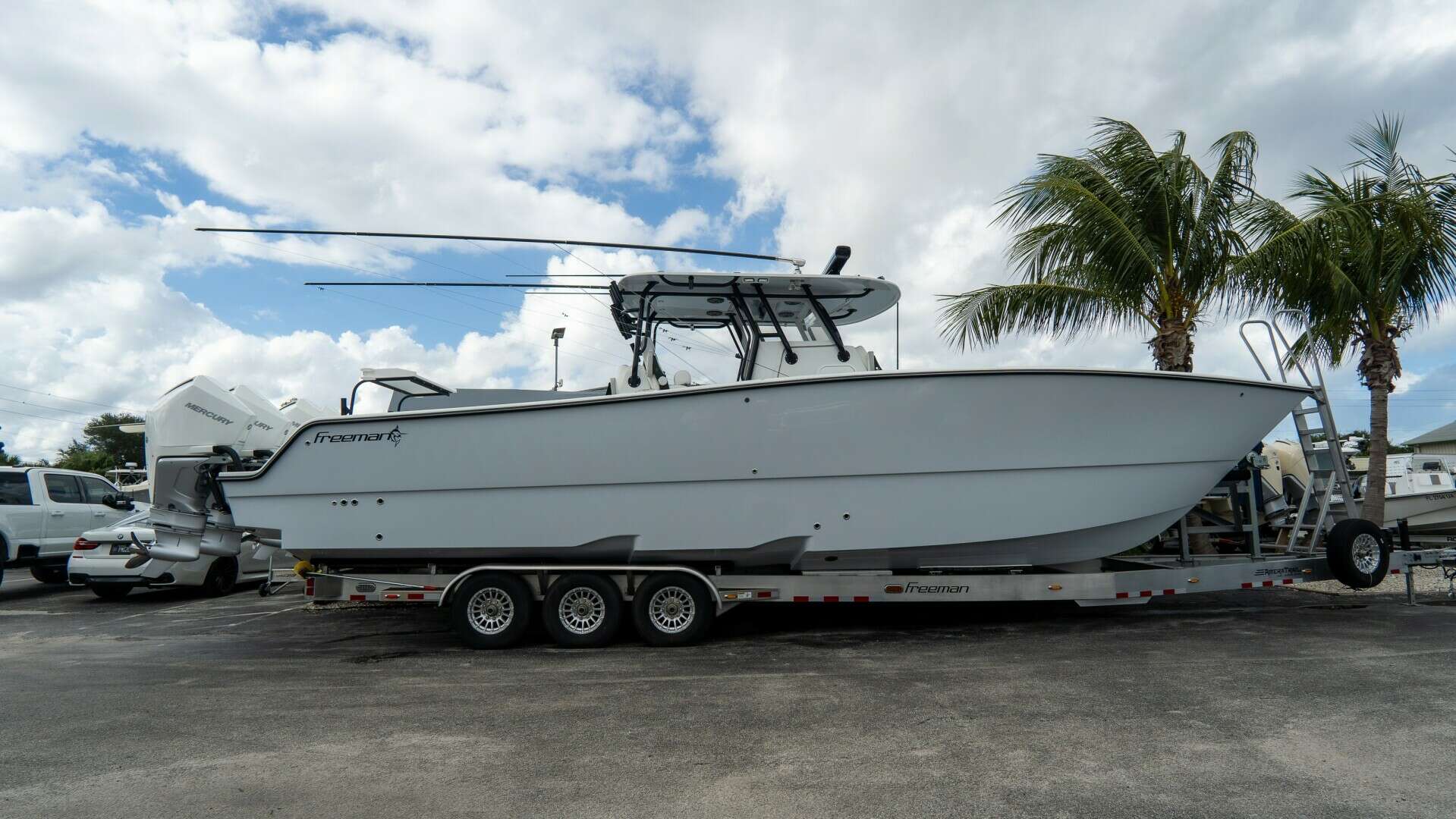 Turnkey 38’ Freeman in pristine condition! Quad 300 Verados (255 hrs), upgraded Garmin electronics, Gemlux outriggers, JL Audio, and more. Whisper Grey finish, loaded with options, AmeraTrail trailer included — skip the wait and own this offshore beast today!