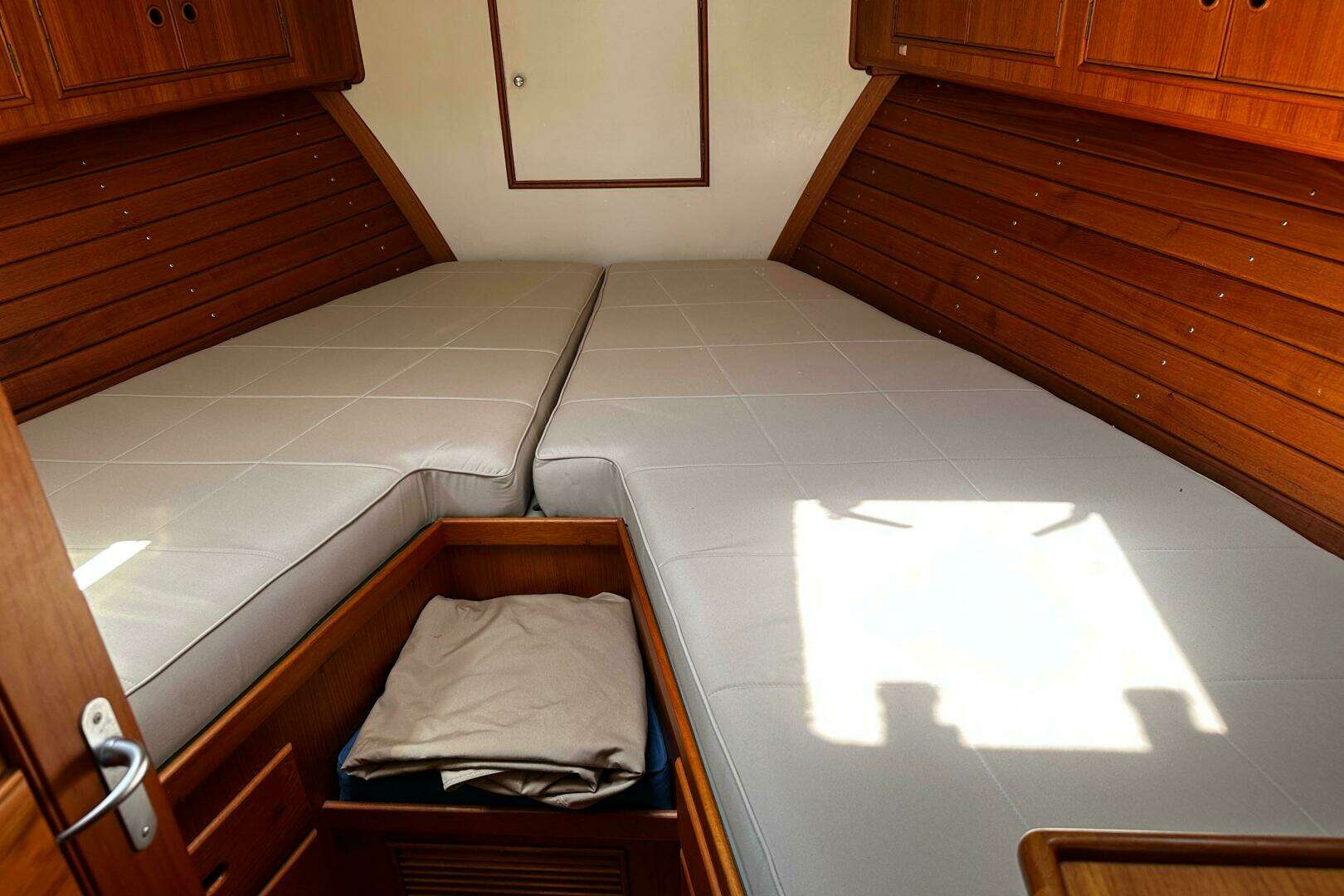 The legendary GB Eastbay 38 designed by C. Raymond Hunt Associates offers accommodations for up to four in a single stateroom layout with Vee berth forward cabin and convertible settee. The cabin offers very good natural light and ventilation with three hatches with screens and six ports with screens. This supplemented with reverse cycle air conditioning / heat. The settee is located in the starboard side of the Lower Salon area opposite the galley.
