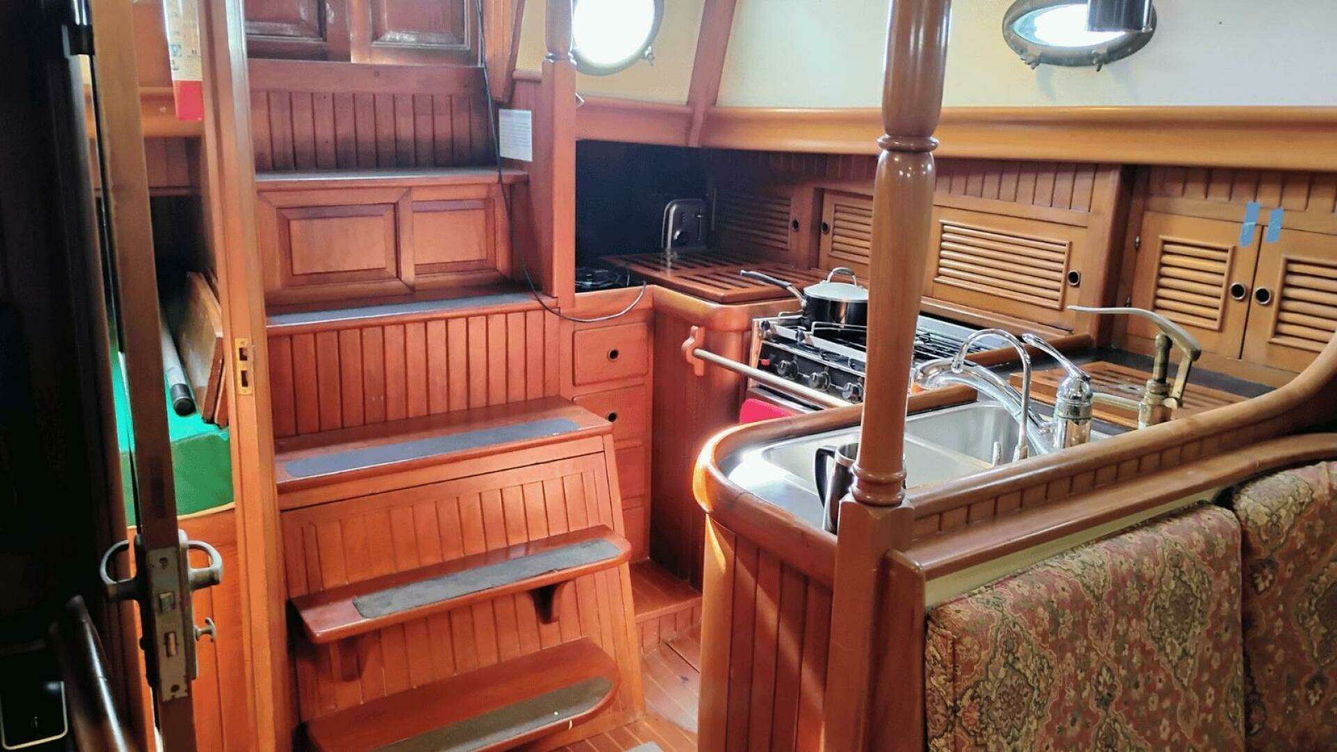 Below Decks: Step into a vessel designed for extended cruising. To port, the fully equipped galley features a gimbaled 3-burner propane stove with oven, top-loading refrigerator/freezer, countertops, and double stainless sink—everything needed to prepare meals in any sea state. To starboard, the first cabin offers a comfortable quarter berth arrangement for guests.