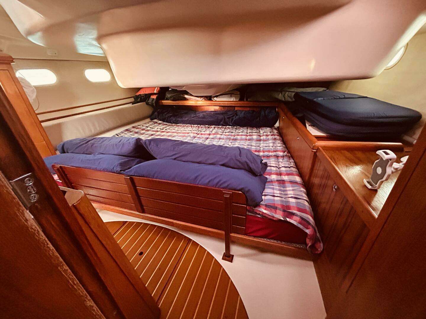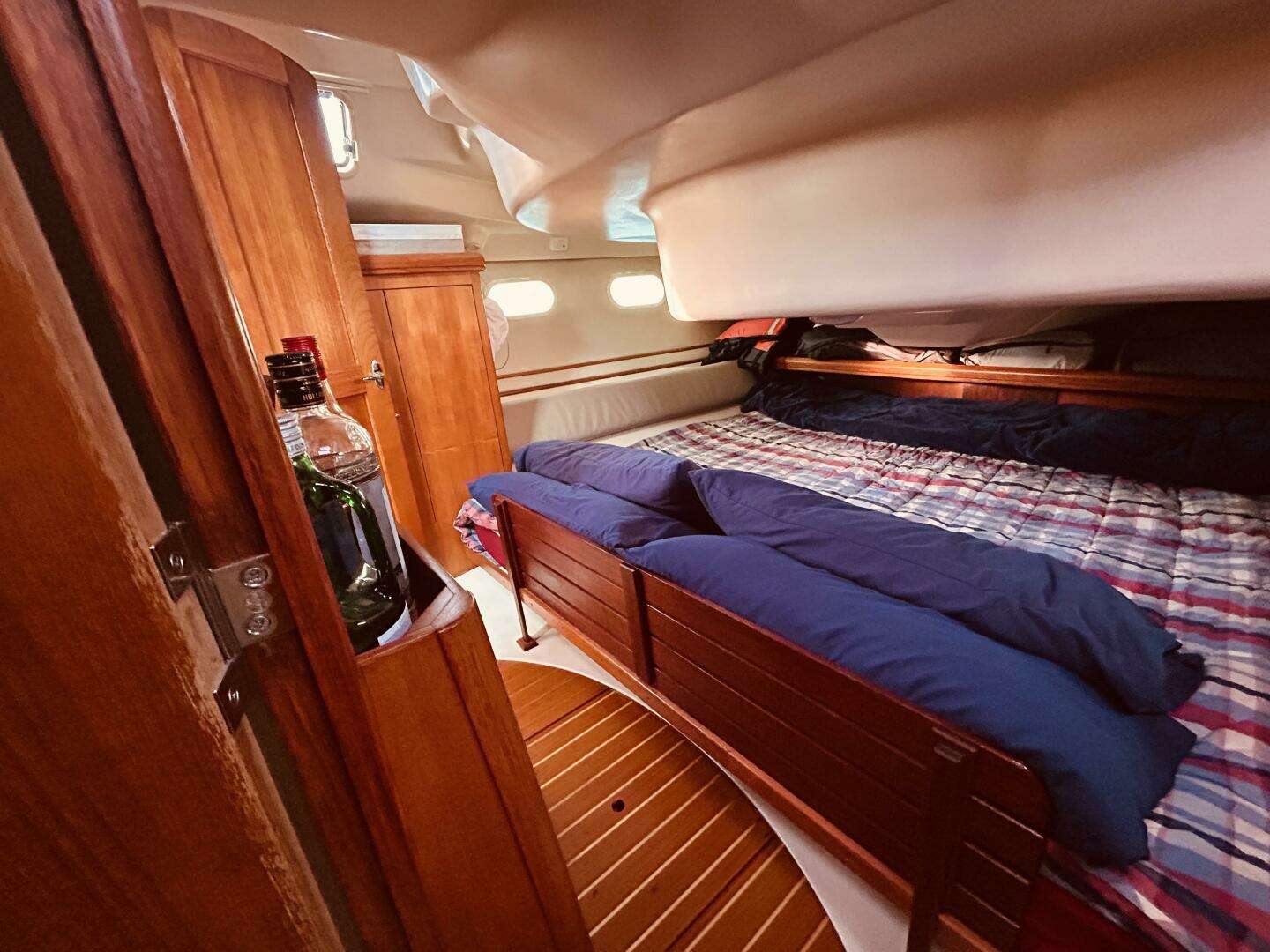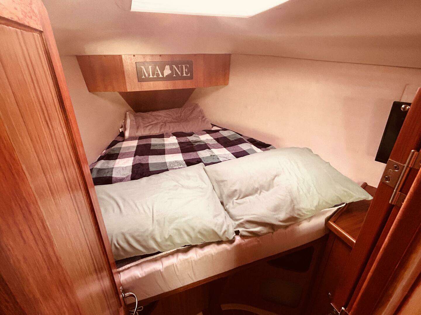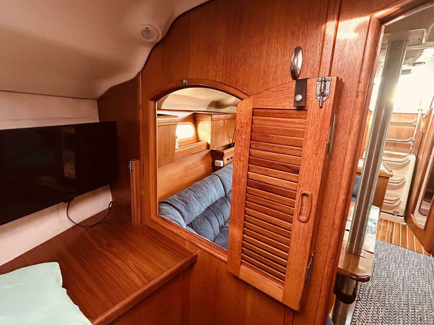 There is a Large V-berth in the Forward Stateroom that was recently extended to form a larger berth. There are storage cubbies beneath, a storage locker and shelf to starboard, and a large hanging locker to port. There is a flatscreen TV on the starboard side and a large deck hatch overhead. There is an open window in the starboard bulkhead facing into the main cabin that can be closed with a louver teak shutter for privacy.