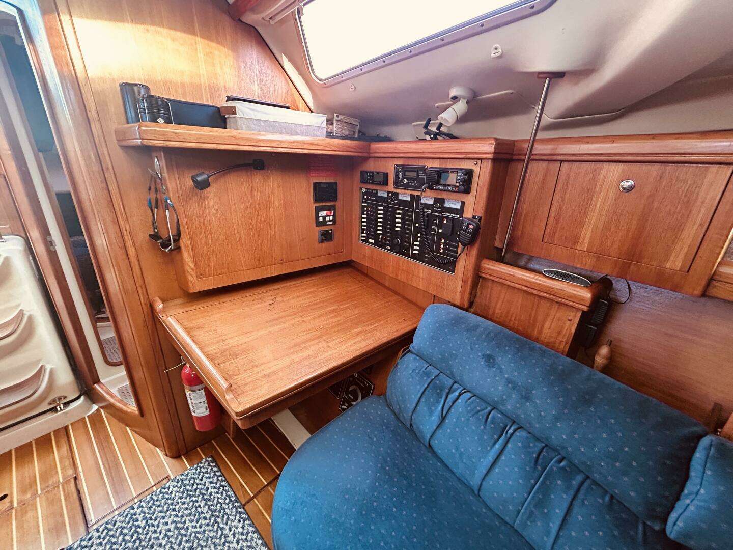 Aft of the port settee is the full-size Nav Desk with storage beneath. the NAV area houses the AC and DC switch panels, the heating and air-conditioning control panel, battery & tank monitors, ship's radio, and the Fusion stereo system.