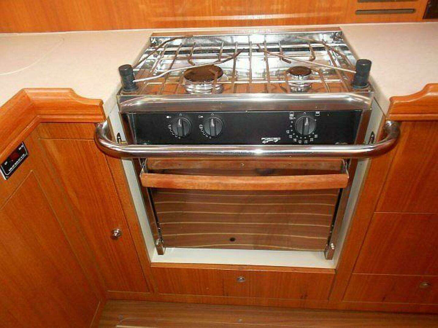 Galley: Located on starboard, the L-shaped galley is big enough to make any cook feel at home. With 6' 4" to 6'6" headroom, there's plenty of maneuvering space. The countertops are all Corian with tall cherry finish fiddles, so good handholds are all around you. Facing forward, the polished stainless double sink has a large prep surface to the left of It and more counter space to the right, with a Corian lift-up lid covering the waste bin. There is plenty of storage beneath the waste bin for less-often used items. Beneath the counter is an upright refrigerator/freezer to the left and shelving space with double doors beneath the sink.