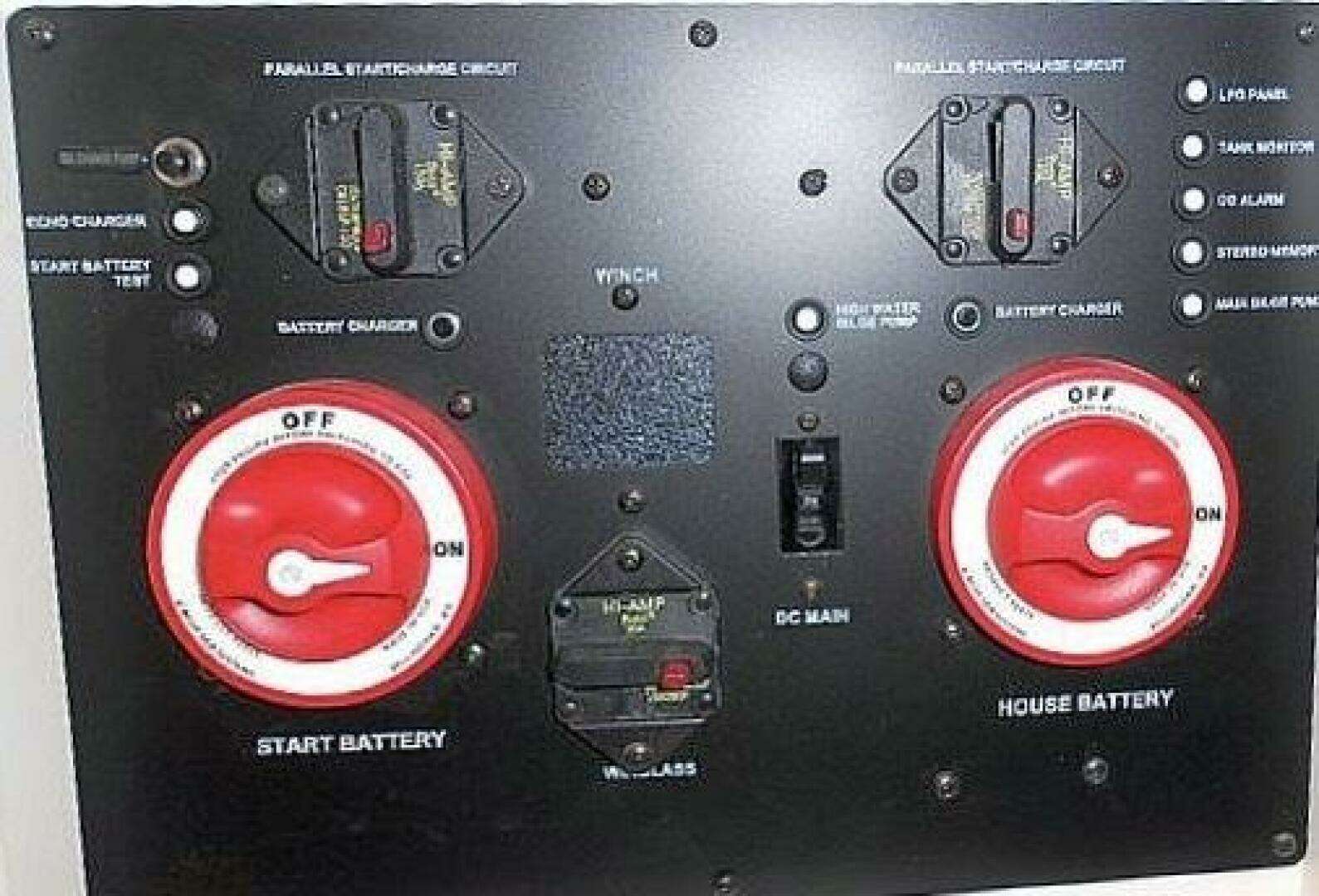Nav station: Forward facing, the nav is located on the port side aft of the settee. The seat is curved for comfortable seating on any tack while under way. Beneath the seat is access to the battery charger, battery selector switches and assorted other electrical connections. Outboard next to the seat is a locker, while above that the 120V and 12v electrical panels are right at hand. The lift-up lid on the nav table provides access to storage for charts (also known on most boats as "the junk drawer", right?). There is a nav pod with a wooden face and stainless grab rail above the tabletop, providing plenty of space for the installation of electronics.