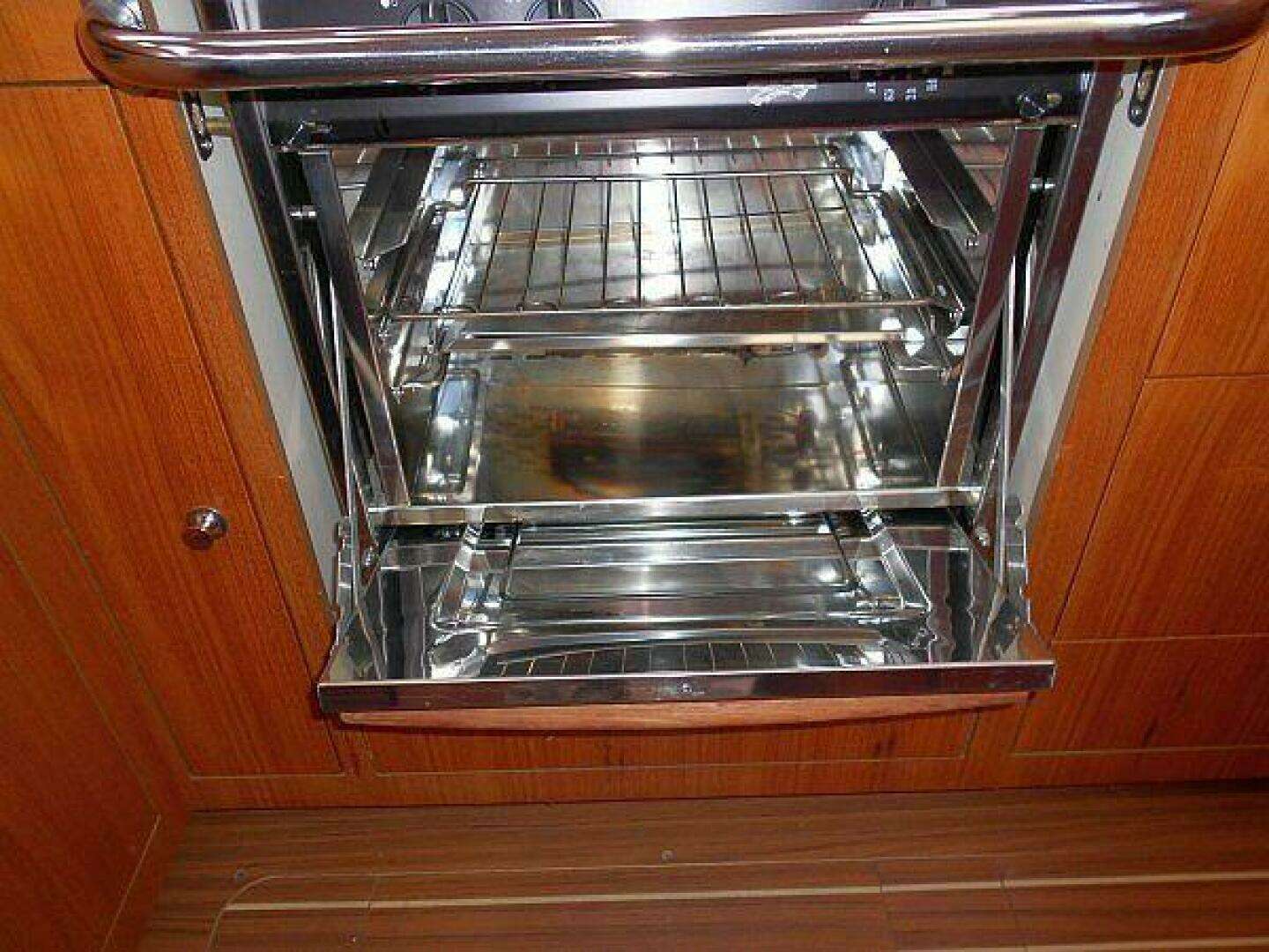 Moving around and along the hullside, beneath the counter and forward of the stove is a pull-out cabinet front with wire shelves. The Force 10 two burner stove is next, with a large drawer under it for pots and pans. To the right is another counter space, with three drawers below that.