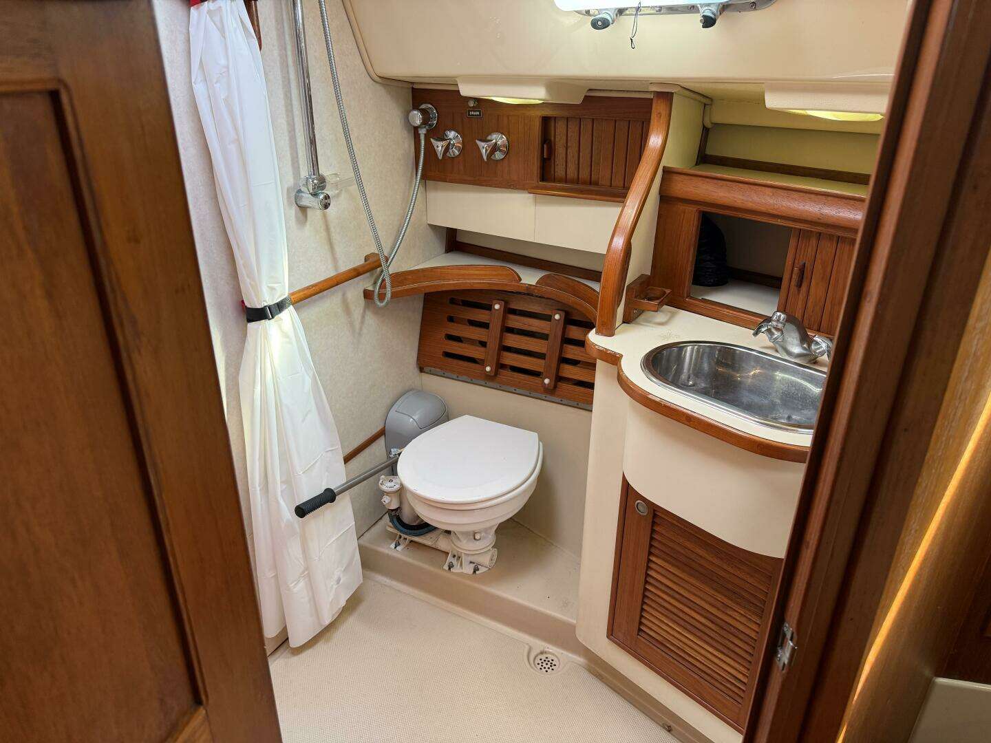 - Head: Large head compartment forward of salon with shower over commode, one opening port and one opening hatch. (There is an AC vent into the head.)