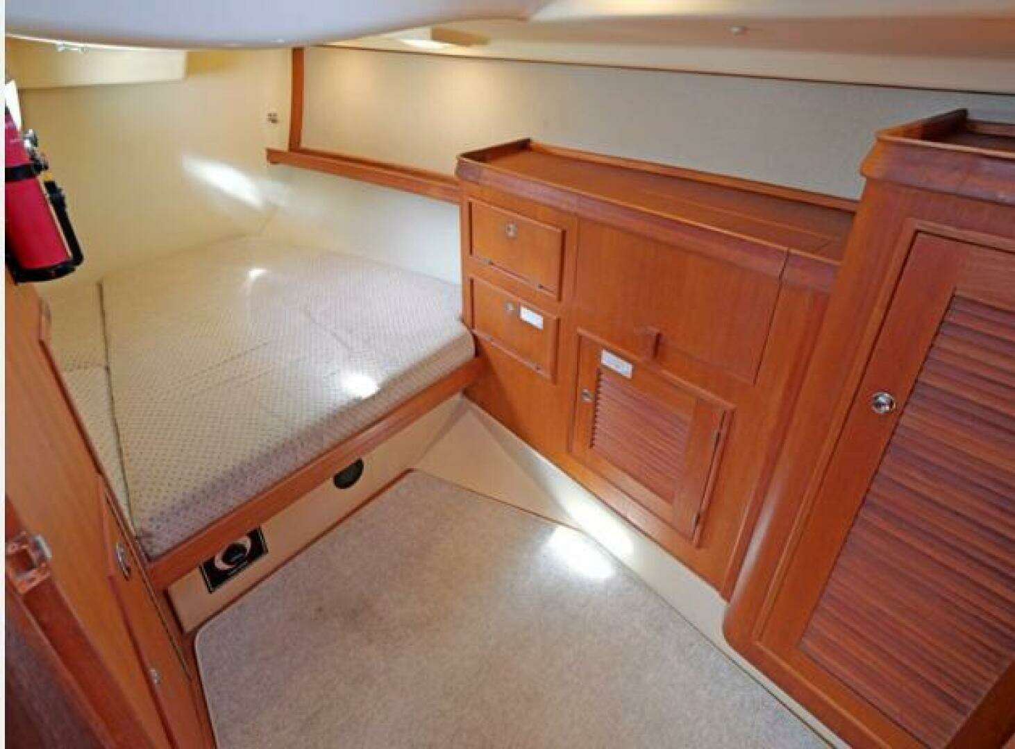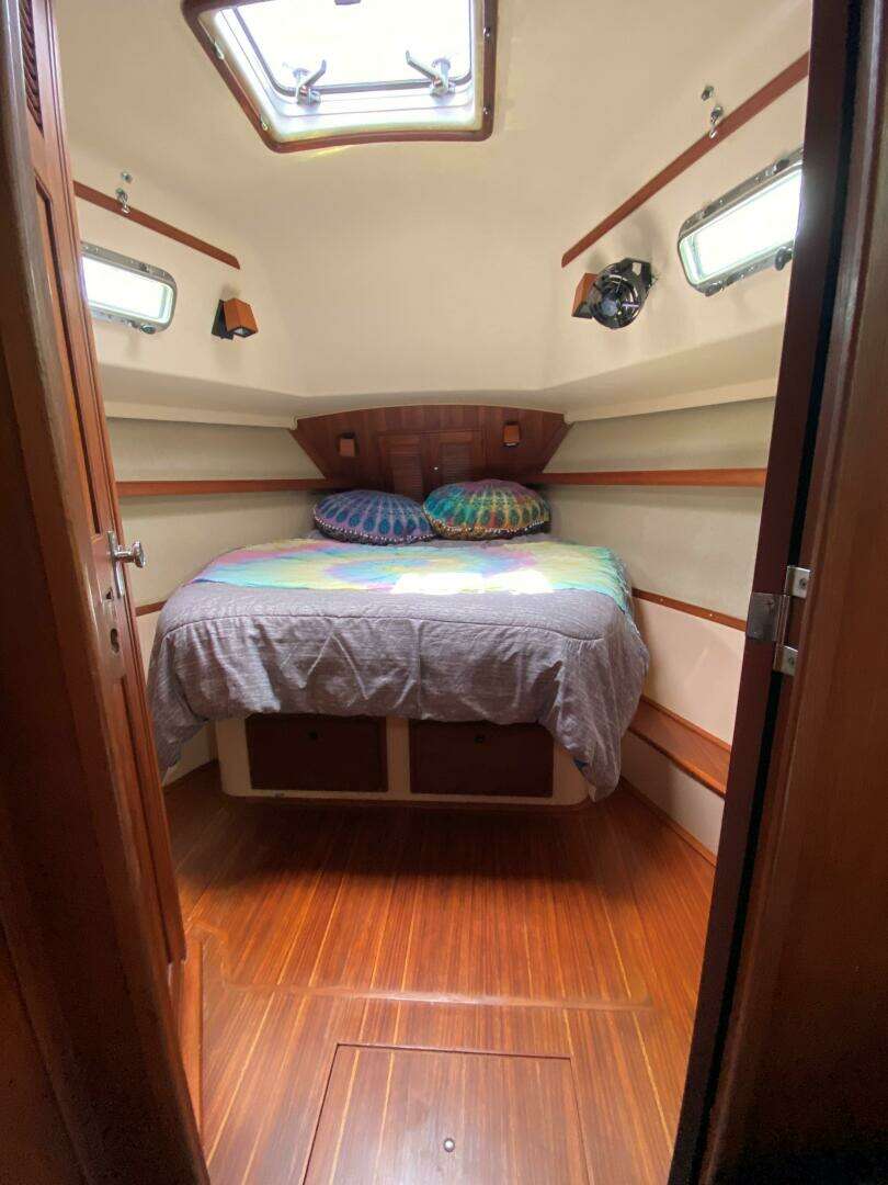 Down below, Antares is a true sanctuary. Designed with liveaboards and long-distance cruisers in mind, the layout is spacious, intelligently organized, and finished in beautifully hand-crafted teak. High-quality joinery, solid wood doors, and durable materials throughout create an interior that is both elegant and enduring. She features a large forward owner’s stateroom with a centerline berth, ample storage, and an en suite entrance to the roomy head with a separate shower stall — a luxury rarely seen in vessels under 40 feet. The aft cabin is equally inviting, offering a generous berth and excellent ventilation.
