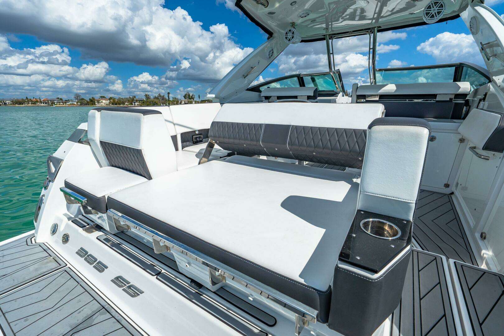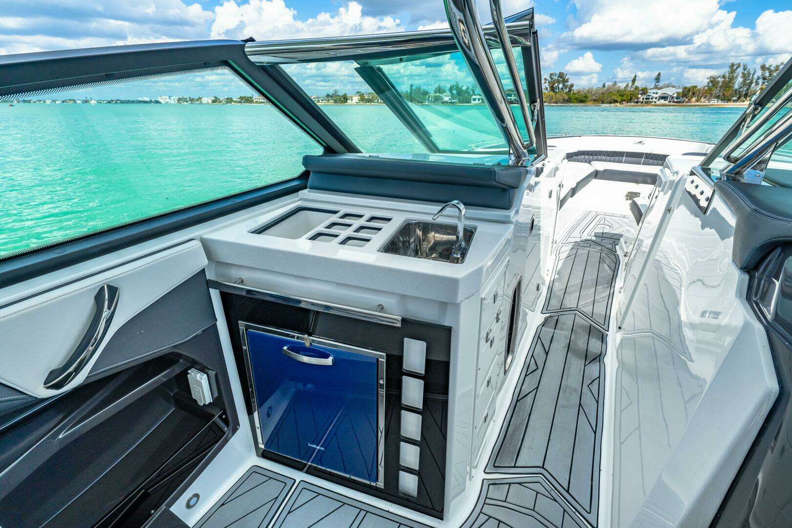 This exceptionally maintained 2023 Monterey 385 SS, powered by Triple Mercury 300 Verados (Painted White-70 Hrs) comes with Hardtop, Electric SureShade & upgraded Simrad Halo Radar. Cockpit includes the Entertainment Package complete with sink, Grill and Fridge. Cabin is fully equipped with berth, microwave, fridge, TVs, and couch. The Head is designed with toilet, vanity w/sink, vanity mirror & closet. Mercury Marine Skyhook GPS Virtual Anchor and Joystick Control add to the finishing touches!