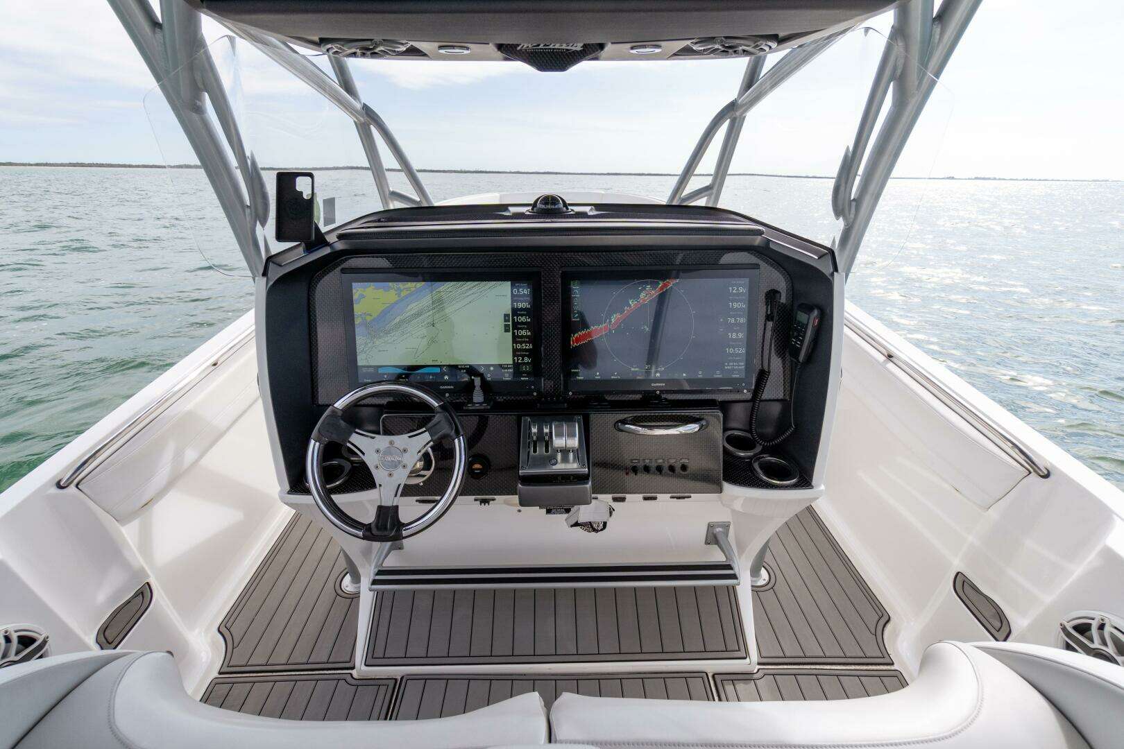 The Nor-Tech 390 Sport is known for its sleek styling, top-tier handling, and smooth ride in all conditions. The stepped hull and deep-V design offer exceptional efficiency, while the triple 450Rs push her effortlessly beyond 80 mph. Inside, the spacious cockpit and air-conditioned cabin make her equally suited for offshore runs or sandbar days with family and friends.