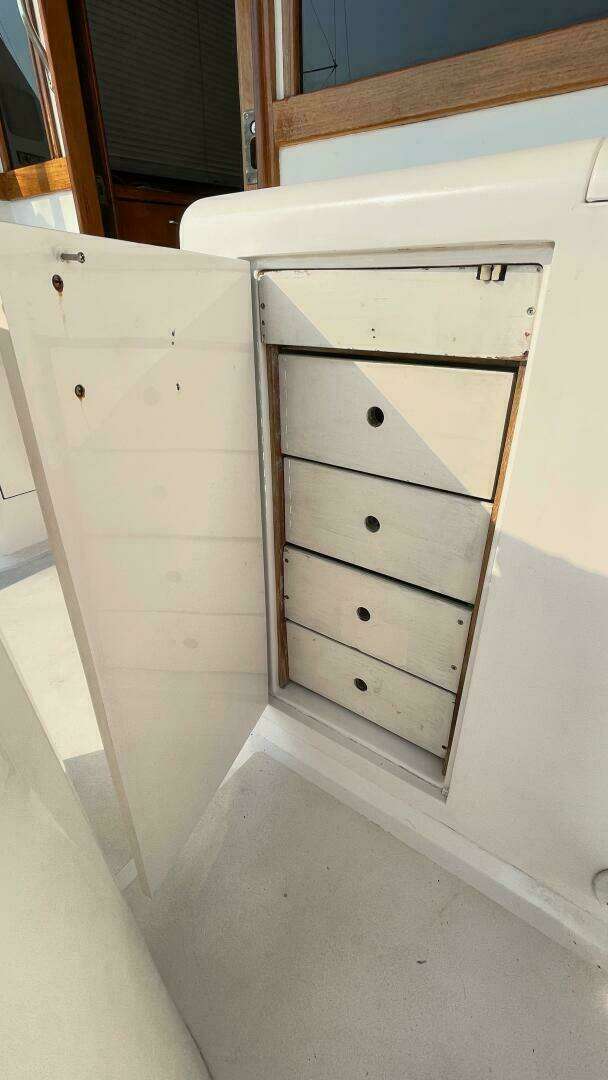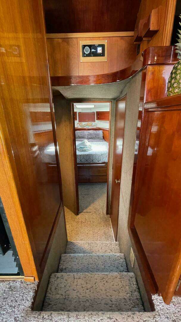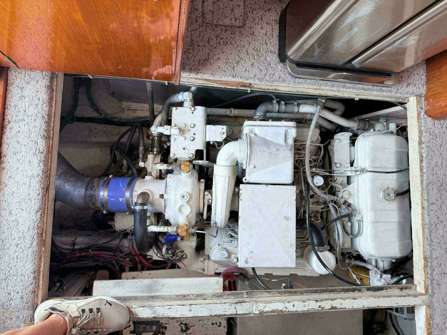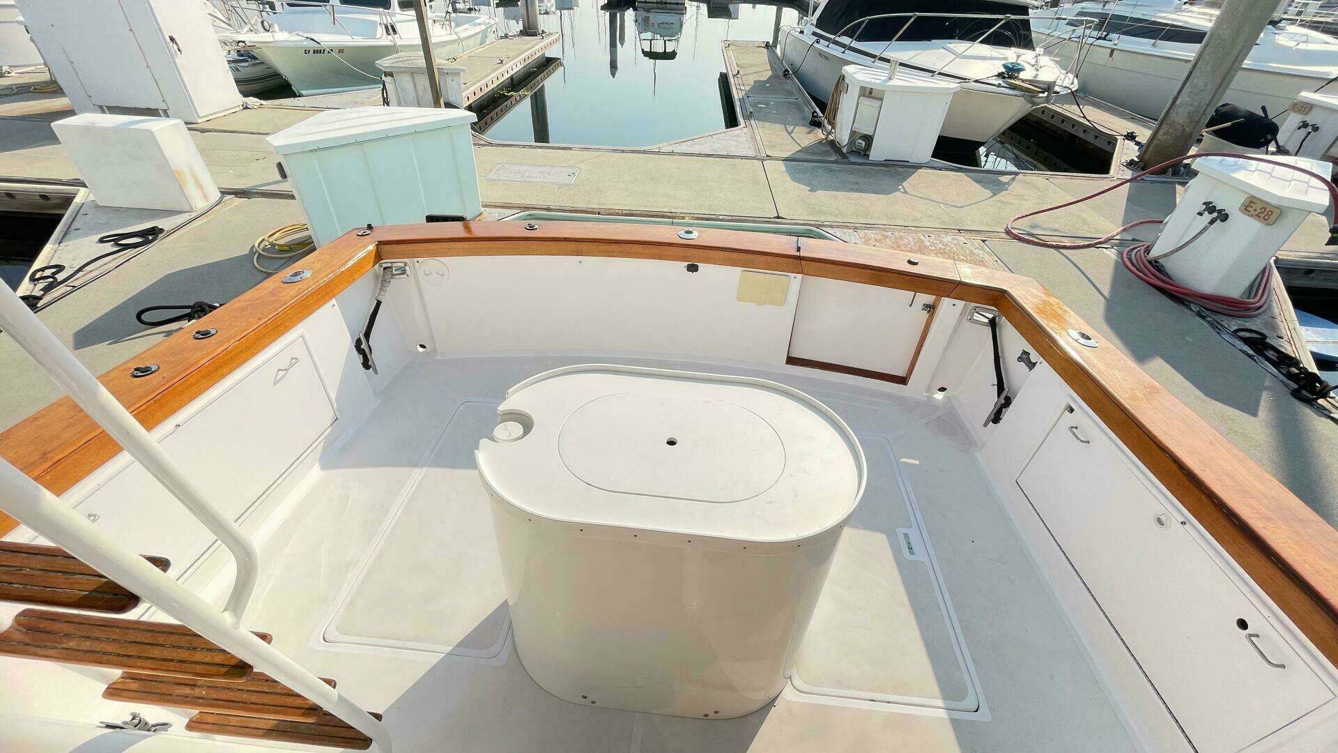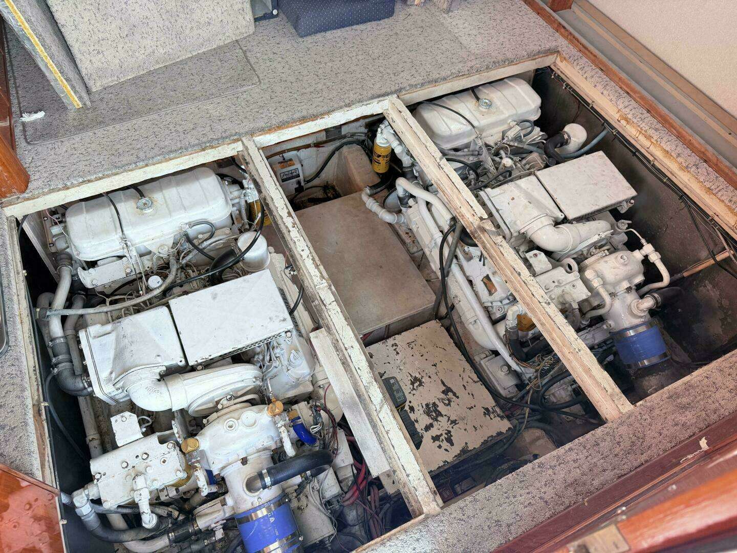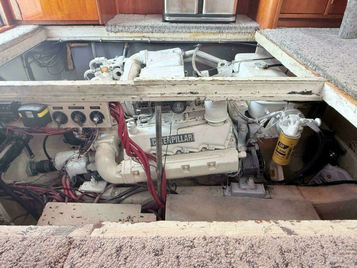 This is a two-stateroom arrangement with the galley in the salon with plenty of teak joinery and decorator fabrics, and included a separate stall shower in the head as well as a walkaround double berth in the bow stateroom. One of the more appealing aspects of the Ocean 38 is her serviceable engine room. The cockpit is set up for serious fishing and includes a tackle center, freezer, teak sole, and teak covering boards. A stiff ride in a chop, 375hp Caterpillar diesels cruise at a fast 26–27 knots and reach 30+ knots top. Note that a new Ocean 38 SS model was introduced in 1992.