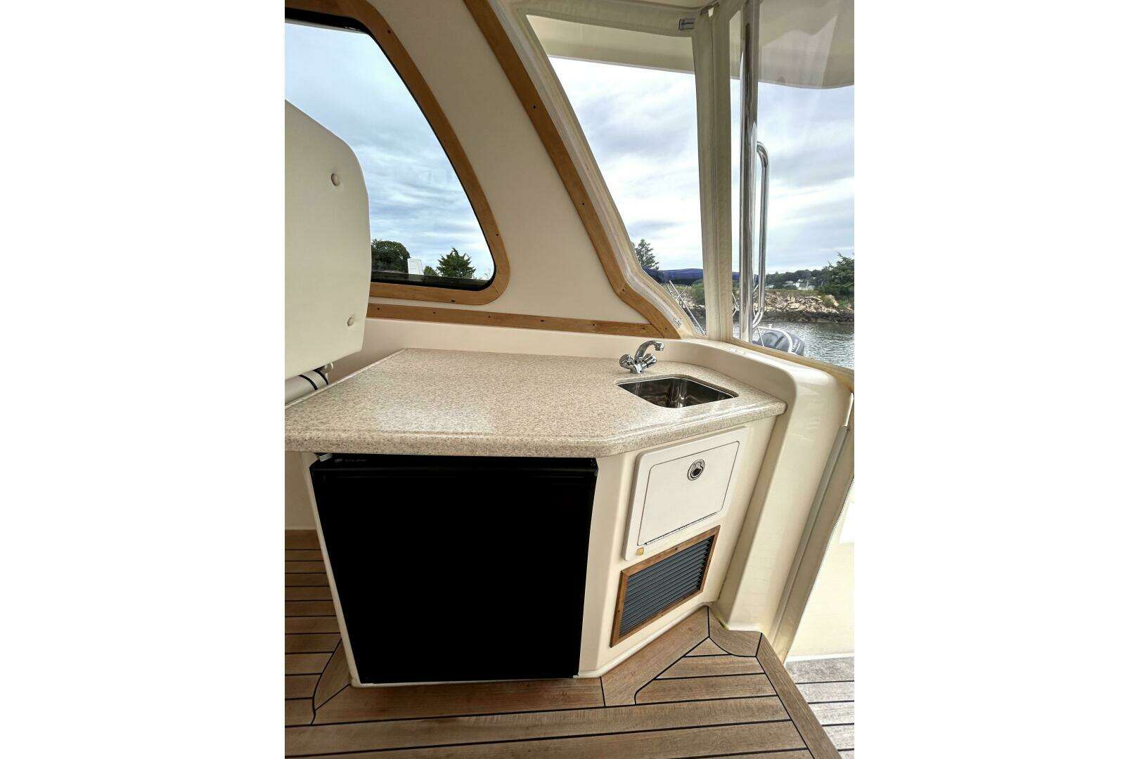 - Wet bar with refrigerator/ice-maker behind captain helm chair