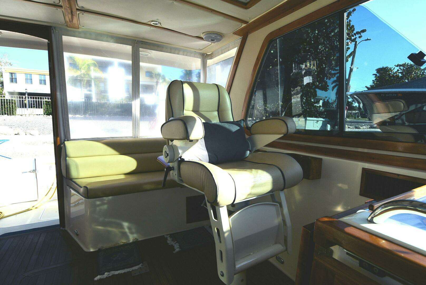 Stidd helm and mate's seat Cherry wood in helm deck interior Sliding companionway hatch Bi-fold companionway door to cabin Clear chart locker cover Wet bar w/solid surface New 2026 refrigerator and sink Forward facing bench and dry storage below Folding table Lewmar sliding hatches overhead w/roller shades Teak deck on helm deck area