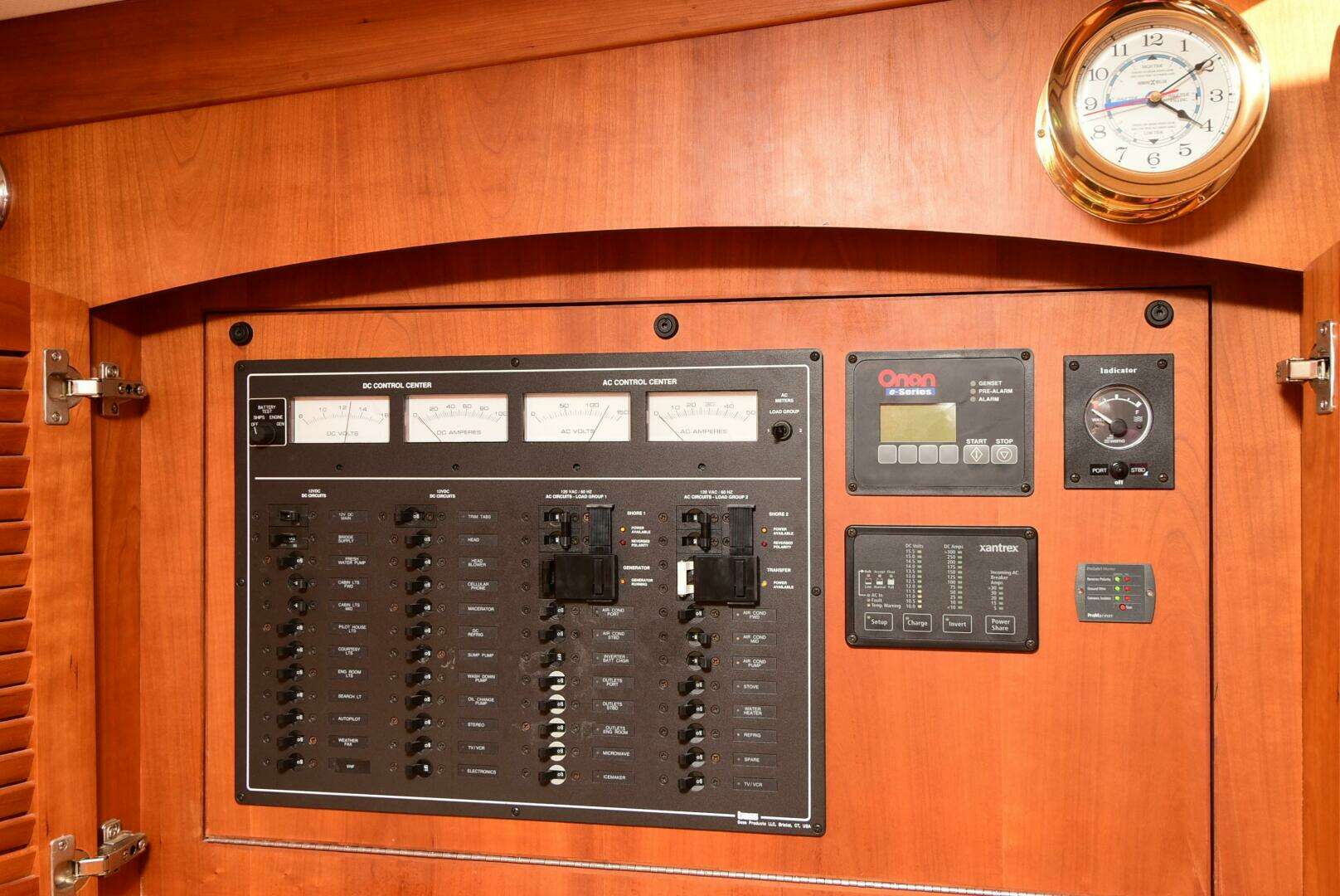 120V AC Electrical System 30 Amp AC shore power inlets w/cord Galvanic isolator w/monitoring system Illuminated main circuit breaker distribution panel 120V outlets in each cabin and one in engine room All galley and head receptacles are GFI protected 50Amp Battery charger Marine Air Cooling Systems Below deck reverse cycle heat/air conditioning Helm deck ac/heater 12V DC Electrical Distribution System Engine start batteries House batteries Battery Management Panel: emergency crossover switch, Ships power switch Starting battery switch Illuminated main circuit breaker distribution panel w/battery condition gauge 12v overhead lighting and reading lights Smart Craft Display 1 3/4" Aquamet 22 stainless steel shaft drip-less shaft seals Four blade Props Seawater cooled 5" side exhaust system Groco raw water intake strainers Onan 9.0Kw generator Reverso Oil Change system.