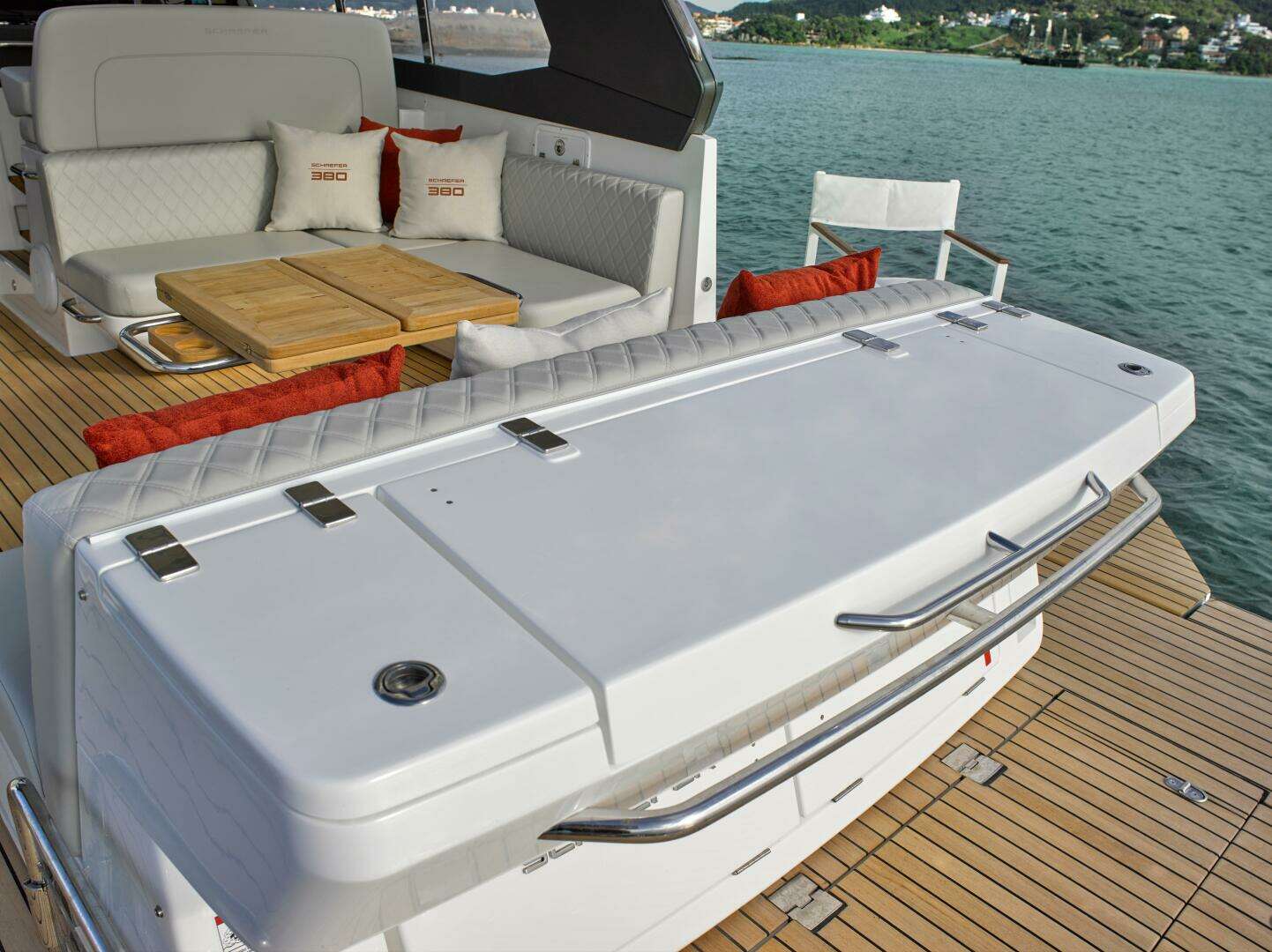 Above deck, the 380 boasts an open cockpit with generous seating, a full wet bar, and seamless access to the swim platform—perfect for entertaining, sunbathing, or enjoying a lakeside lunch. The clean lines and integrated hardtop give the yacht a sleek, modern profile that turns heads in any marina.