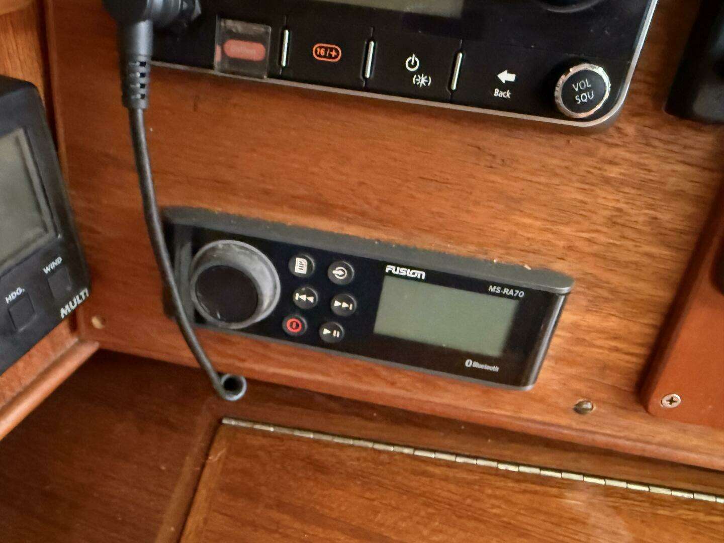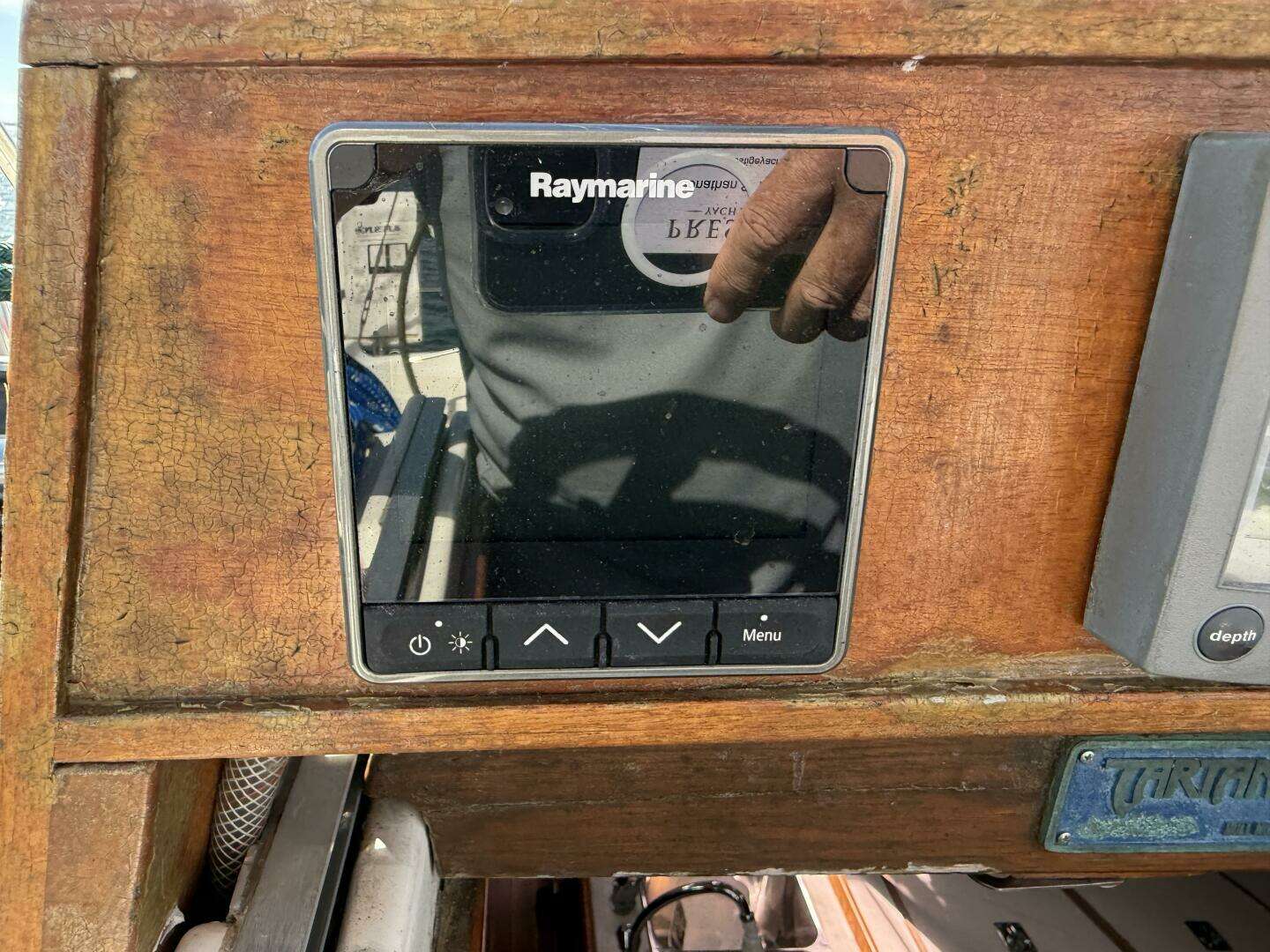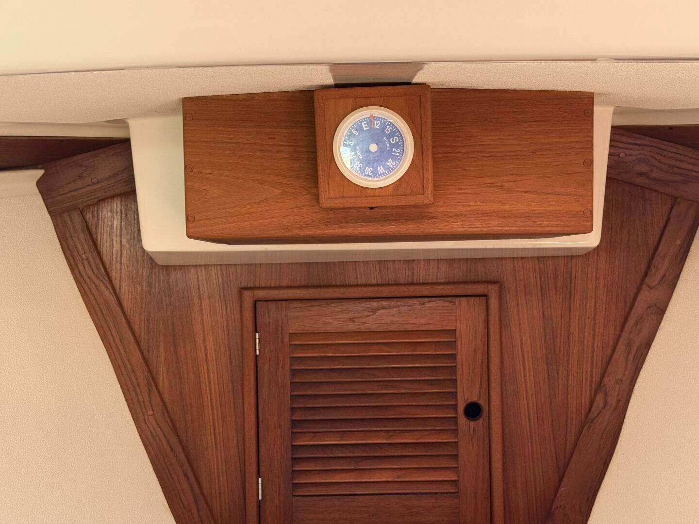 - Teak-faced instrument pod at companionway