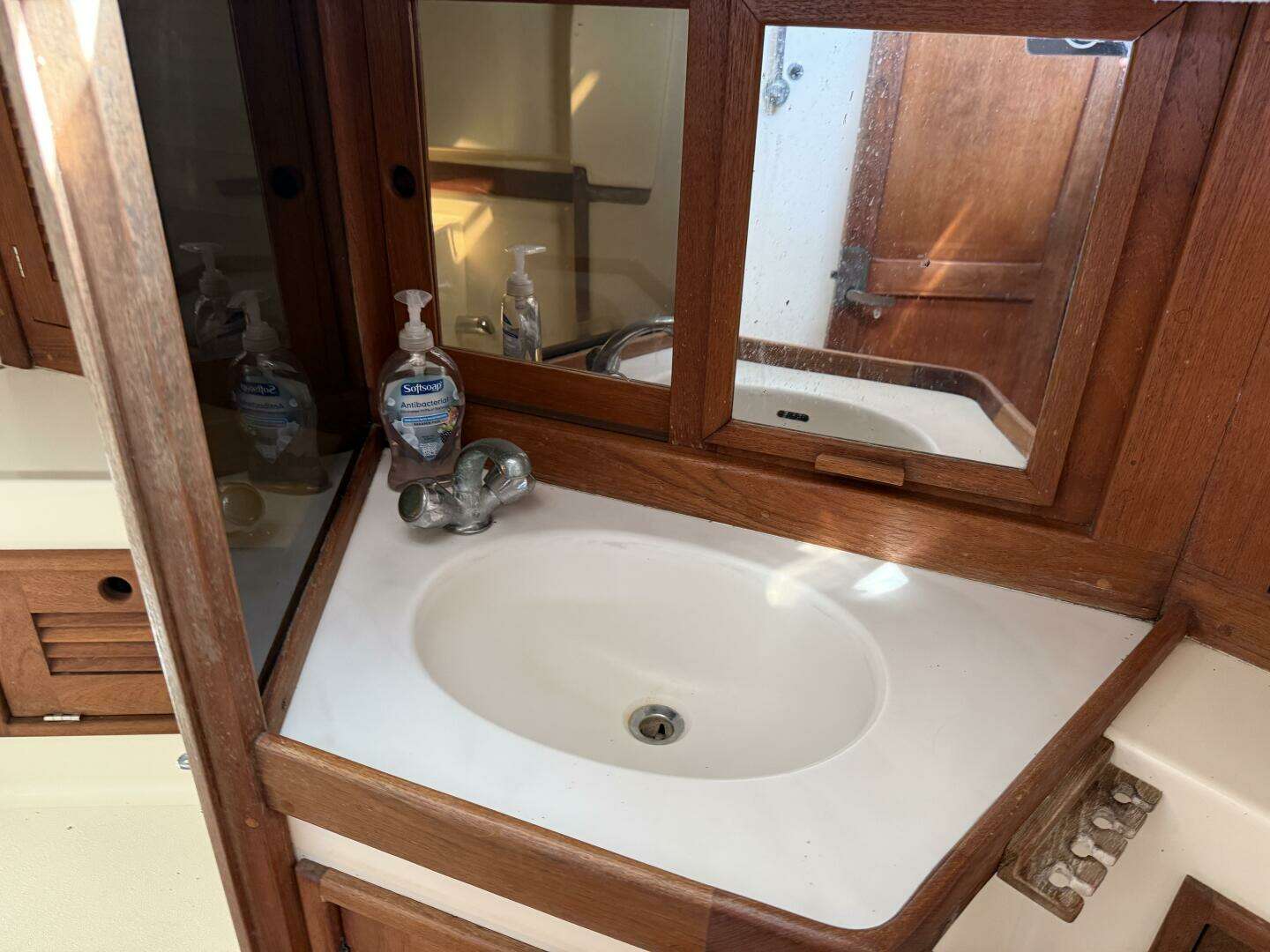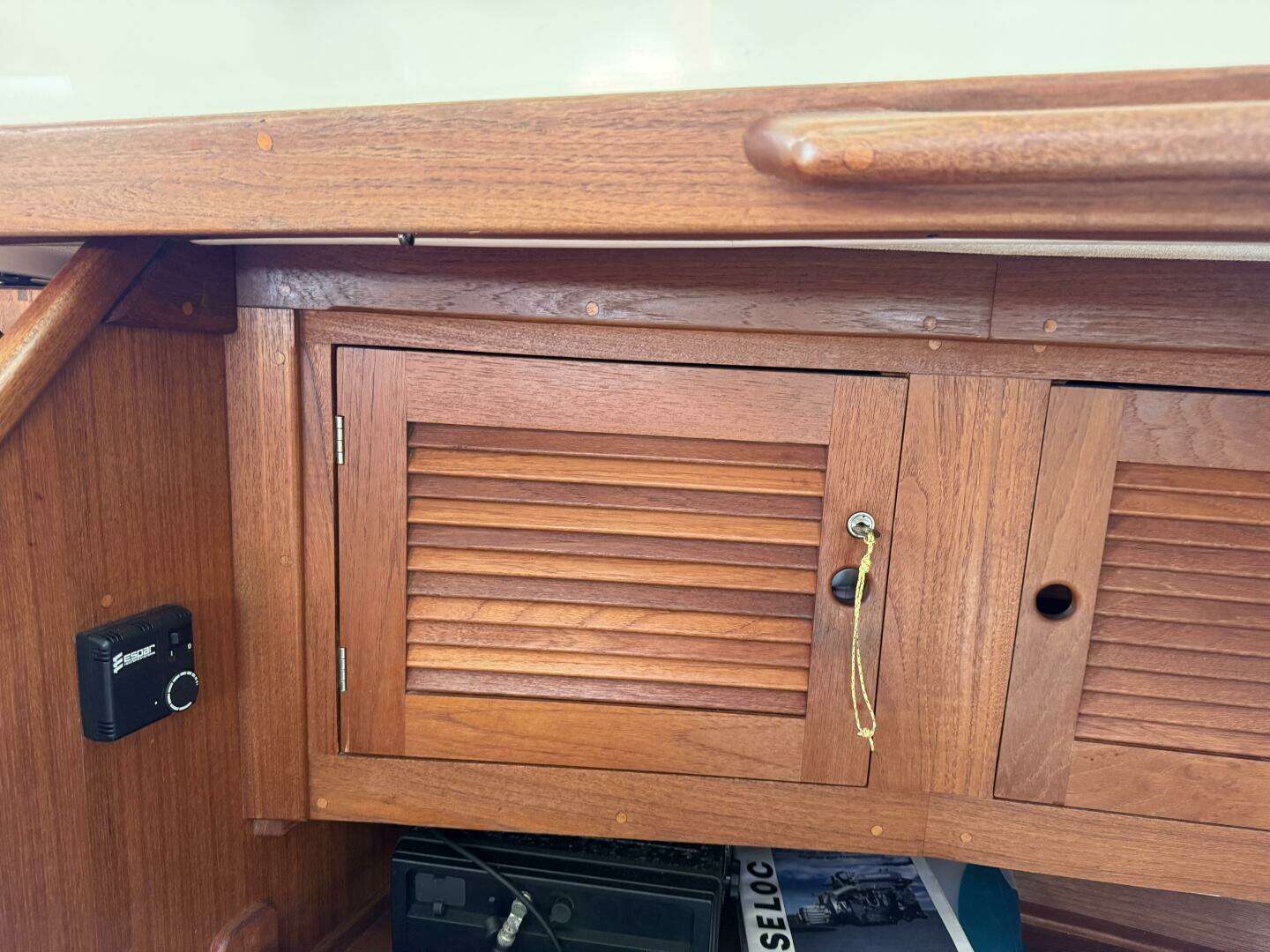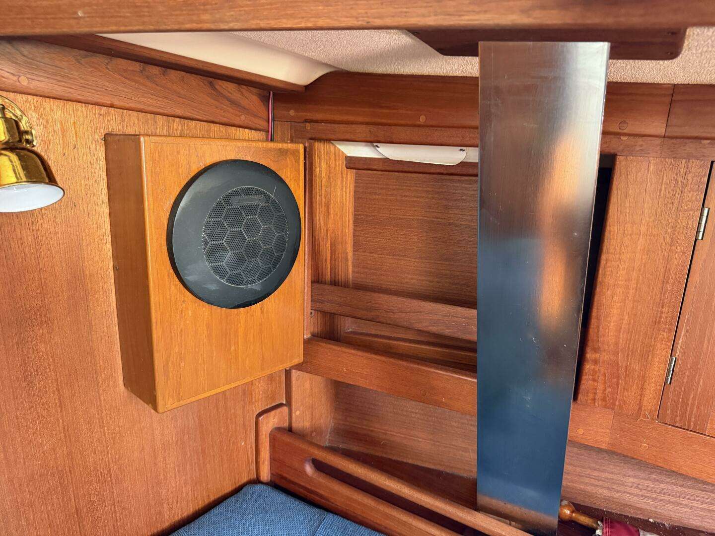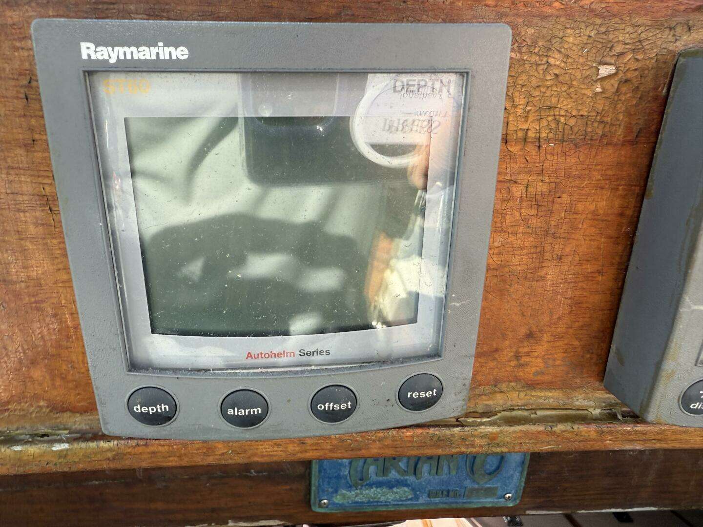 - Teak-faced instrument pod at companionway