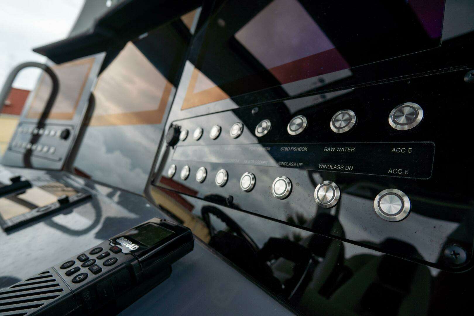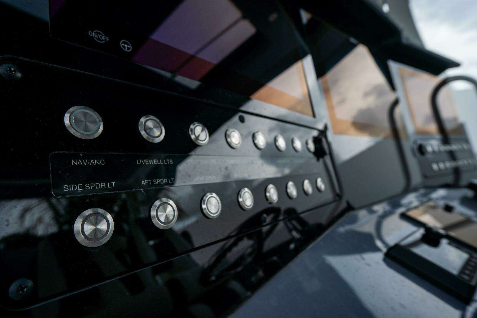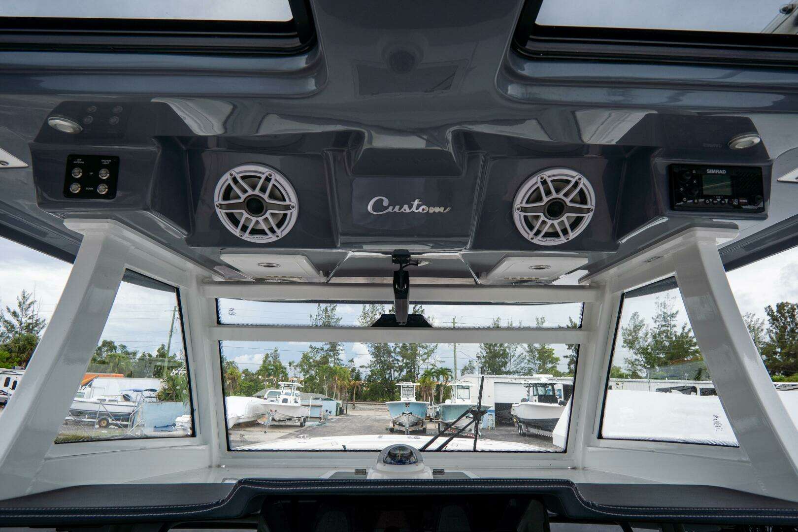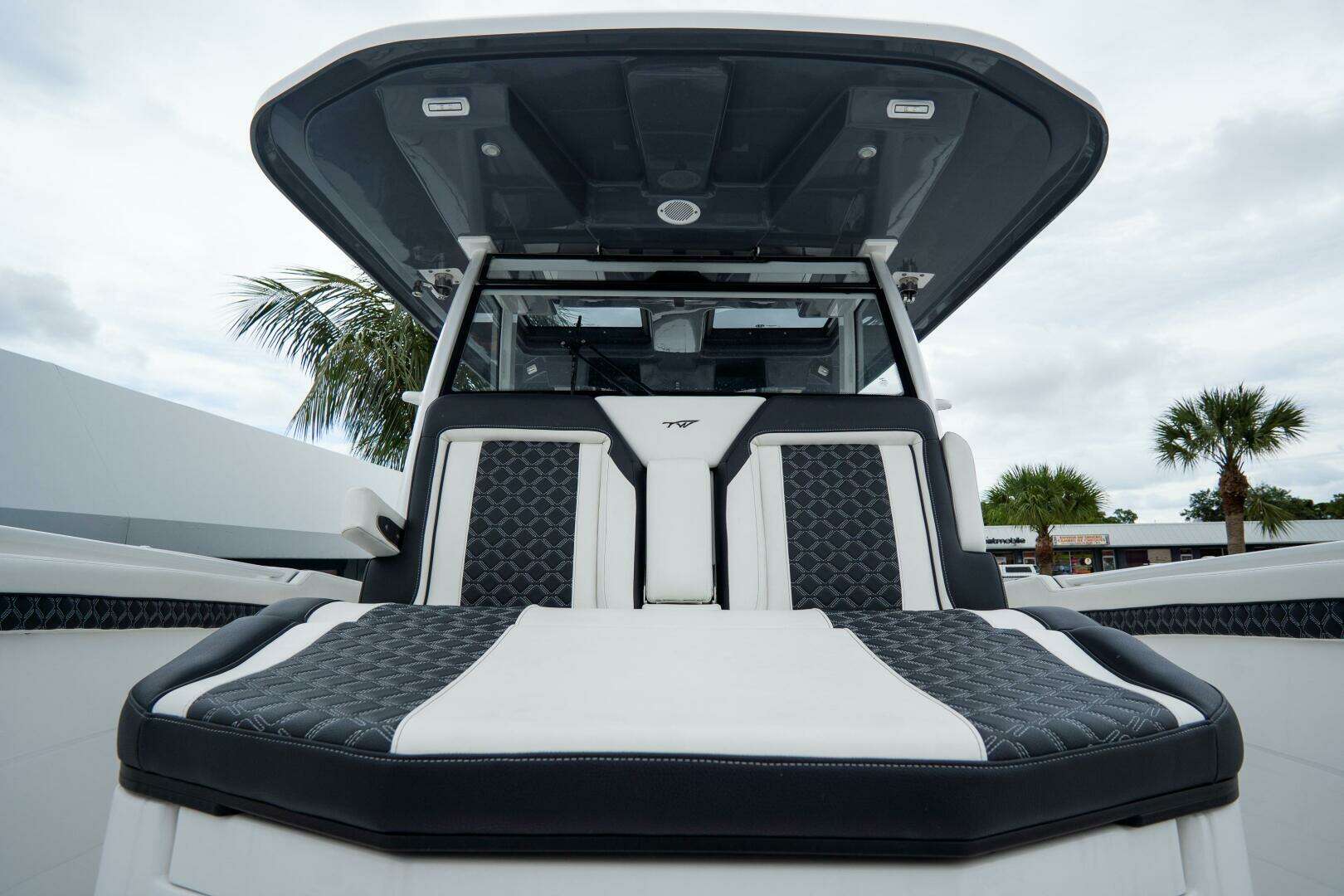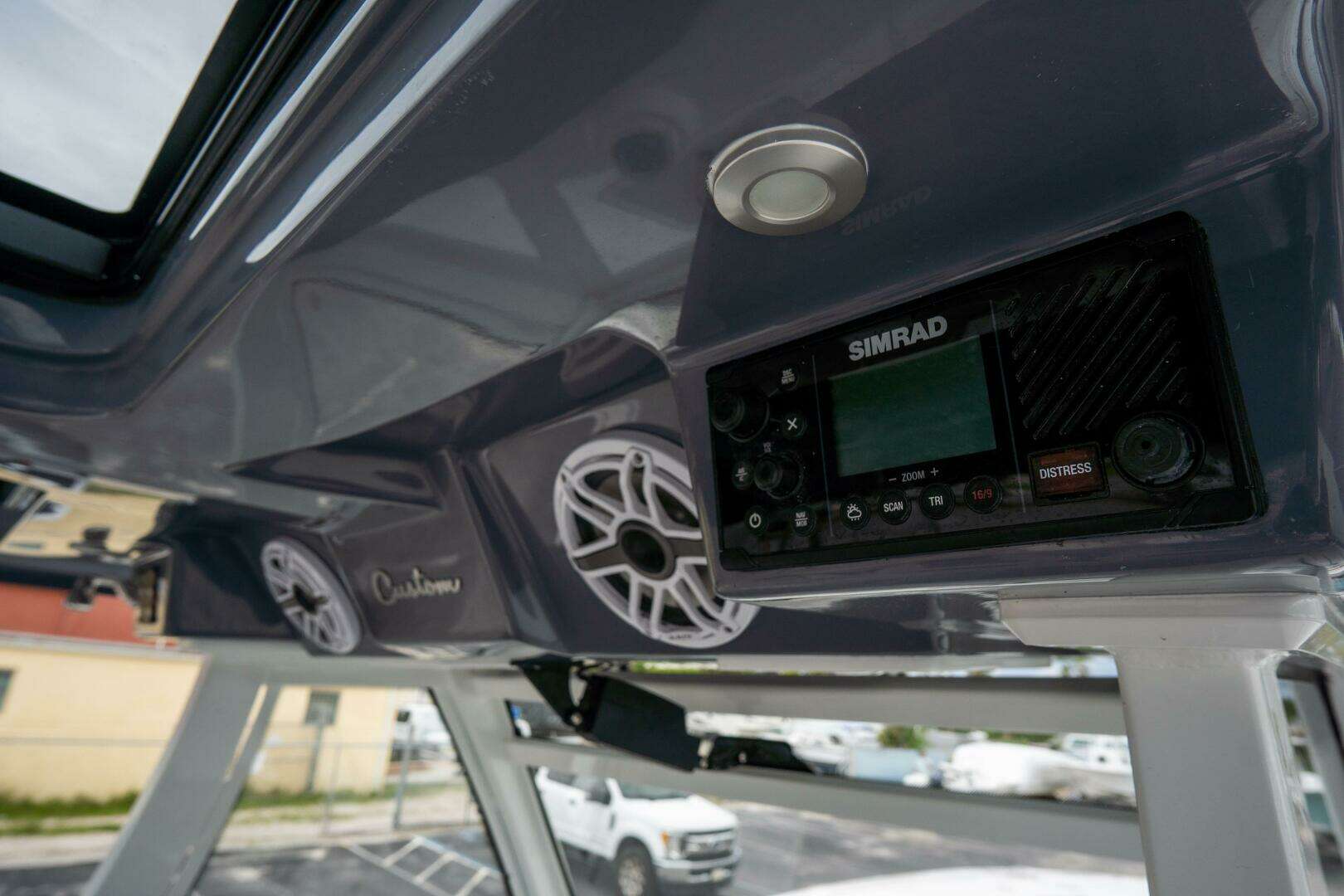 The electronics package is top-tier, featuring Simrad MFDs across the helm: your choice of (1) 19" or (1) 17", plus (2) 16" displays and an additional 12" unit. Also included are a Simrad dome radar, VHF, Airmar 175M HW 1KW transducer, and a second Airmar 175M 1KW setup—giving you serious offshore fish-finding capability.