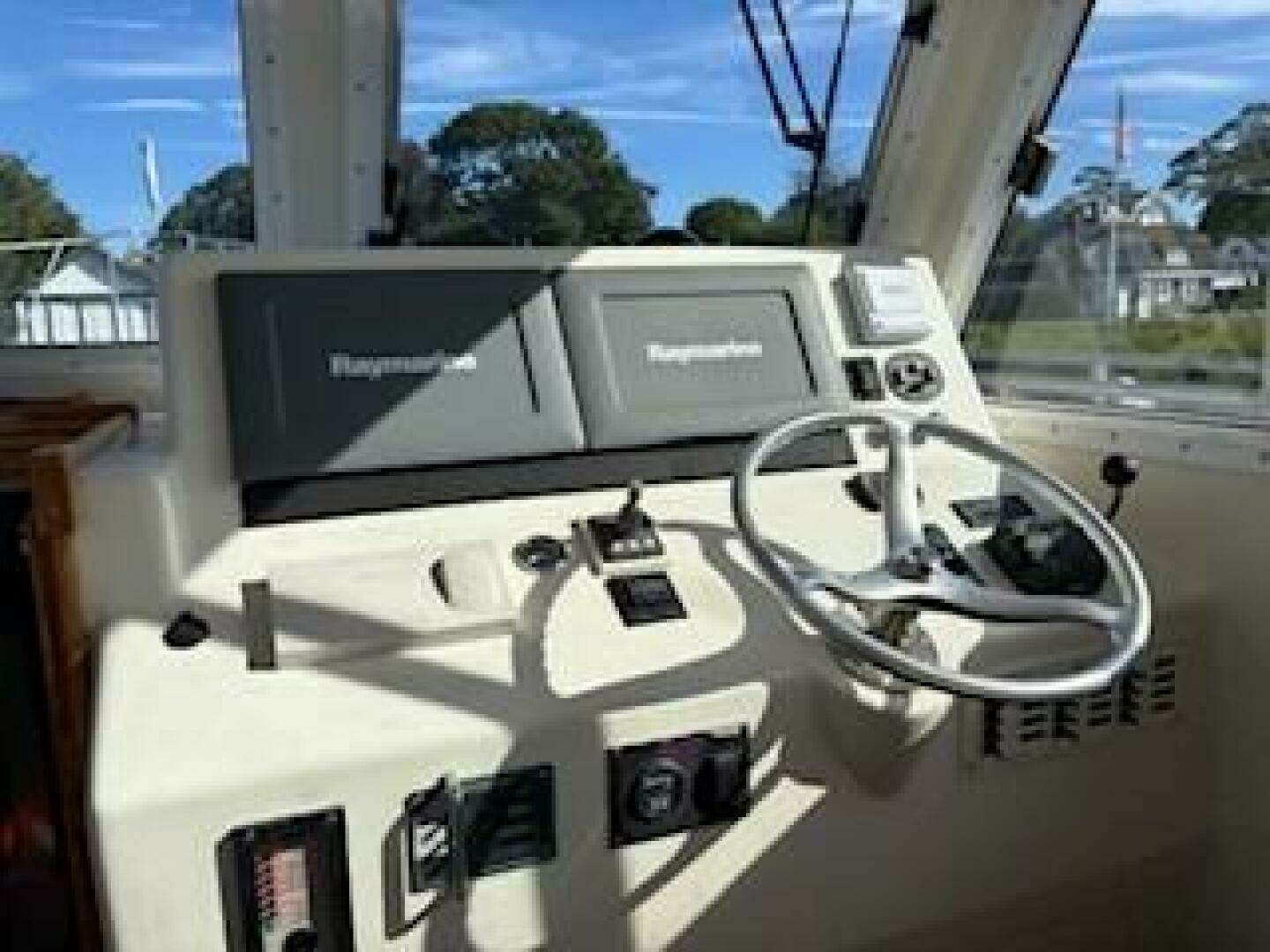 Pilot house interior sides, overheads, bulkheads and joinery finished white with vanished teak trim making the interior very bright and well-ventilated by way of 360 degree visibility / natural light of fixed and opening side windows and forward windshield with additional (electric) lighting provided by stainless steel trimmed overhead dome lighting.