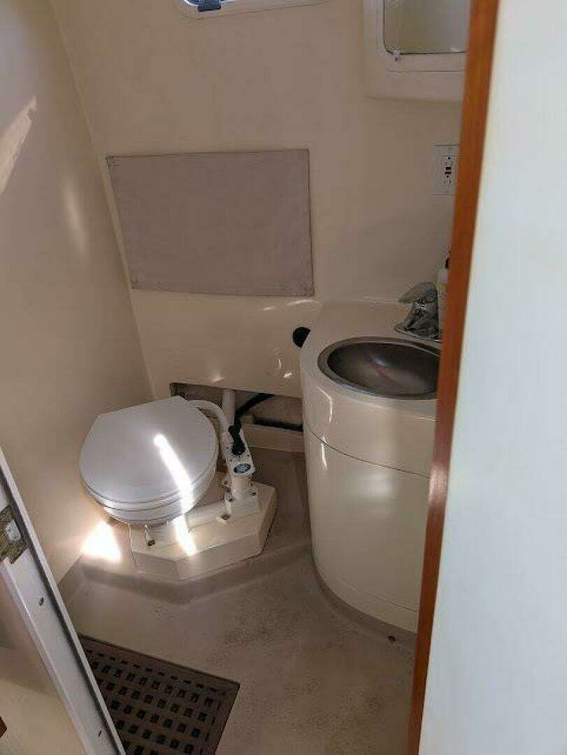 Head area includes manually operated marine toilet, stainless steel sink basin, faucet mixing valve for sink basin water along with a hand-held shower nozzle and is well ventilated by opening port and solar vent.