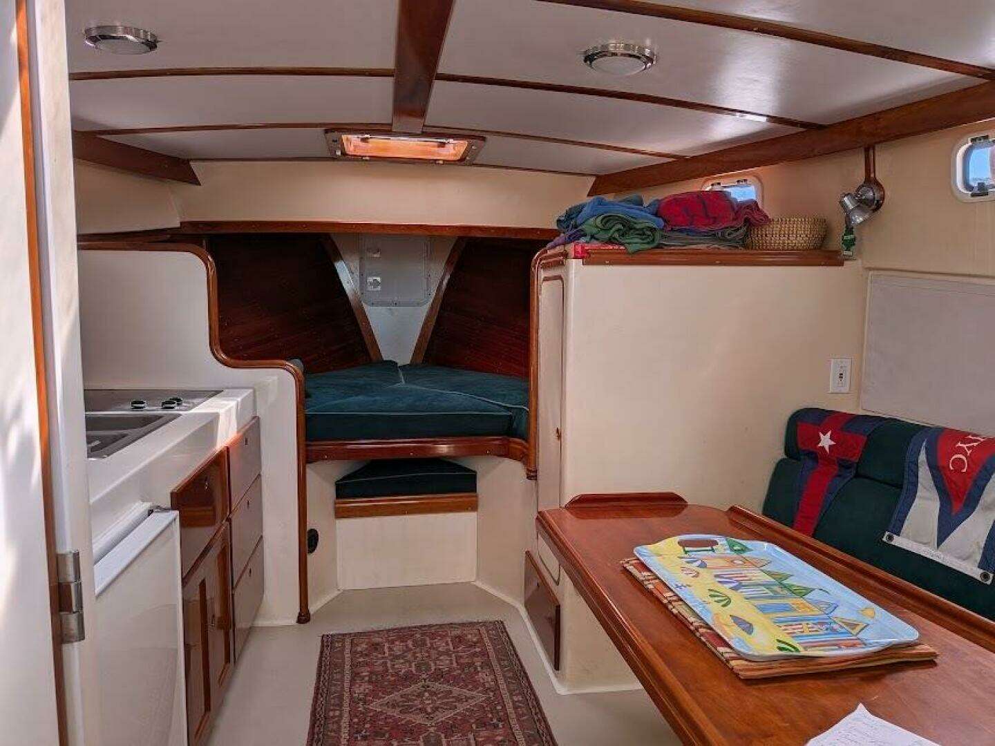 There is a private / enclosed head area immediately to port and (opposite) a comfortable dinette style seating area to starboard.