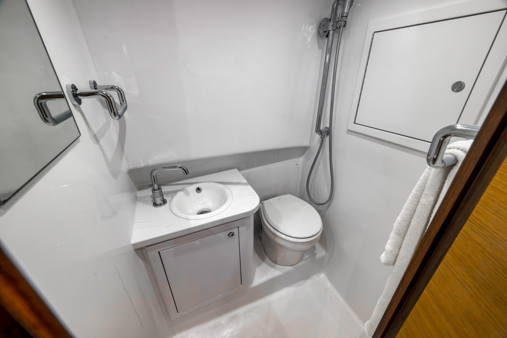 Inside, the cabin offers a welcoming retreat with custom finishes throughout, including Teak and Maple woodwork, as well as a refrigerator. You’ll find comfortable seating, a well-appointed galley, and sleeping accommodations perfect for overnight trips or weekend getaways. Every detail reflects the quality and individuality that only a custom-built yacht can provide.