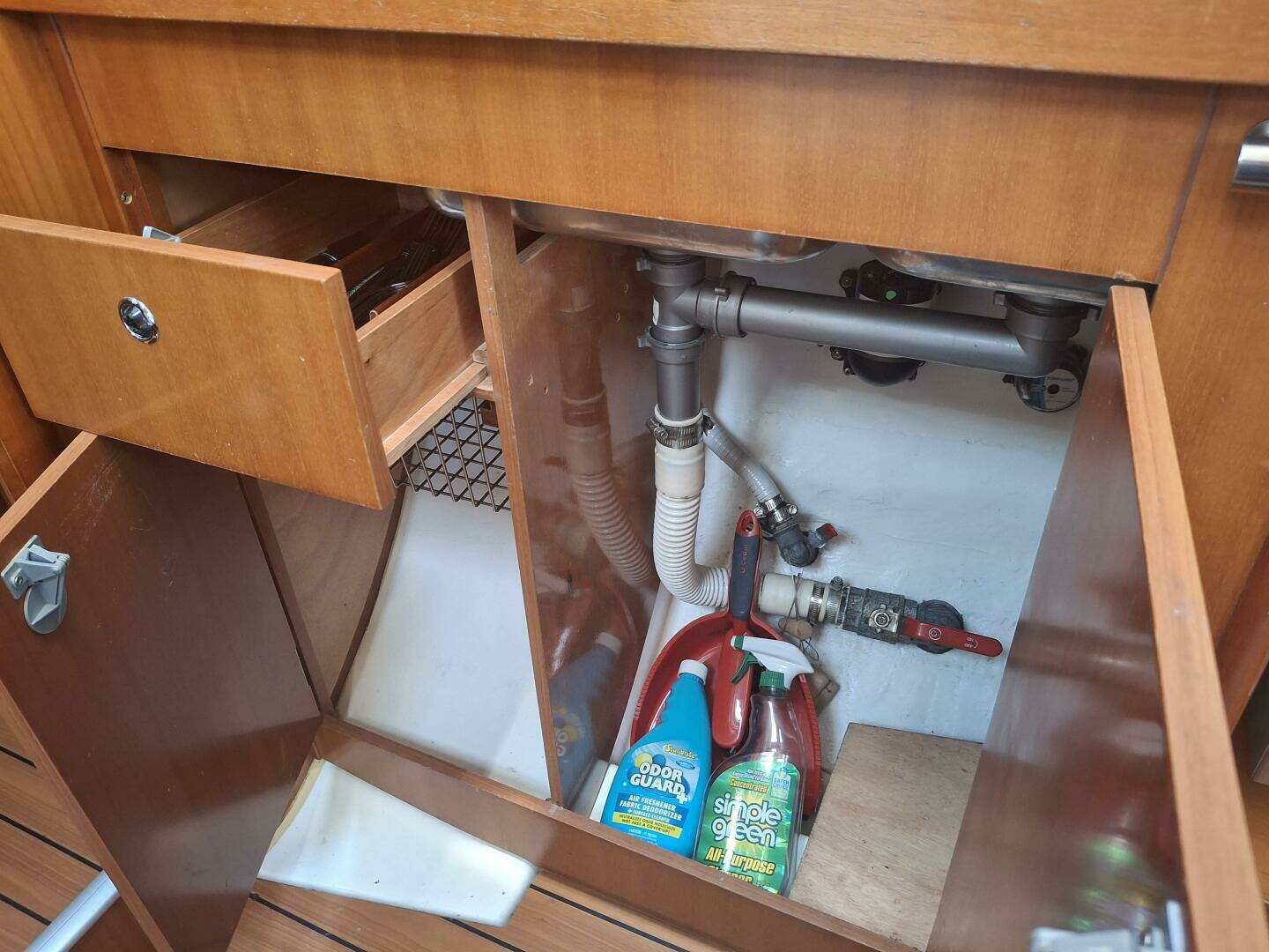 - Fully equipped galley with double SS sink, 3 burner propane stove and microwave