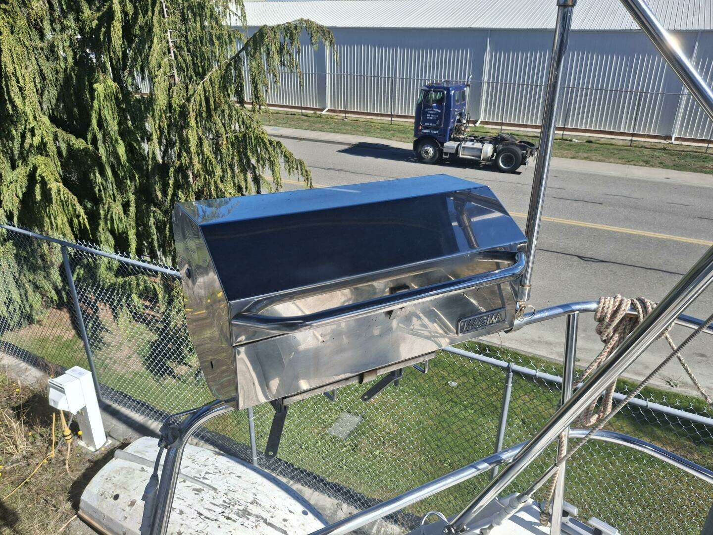 - Stainless steel gimballed two-burner gas stove and oven with protective stainless steel safety rail.