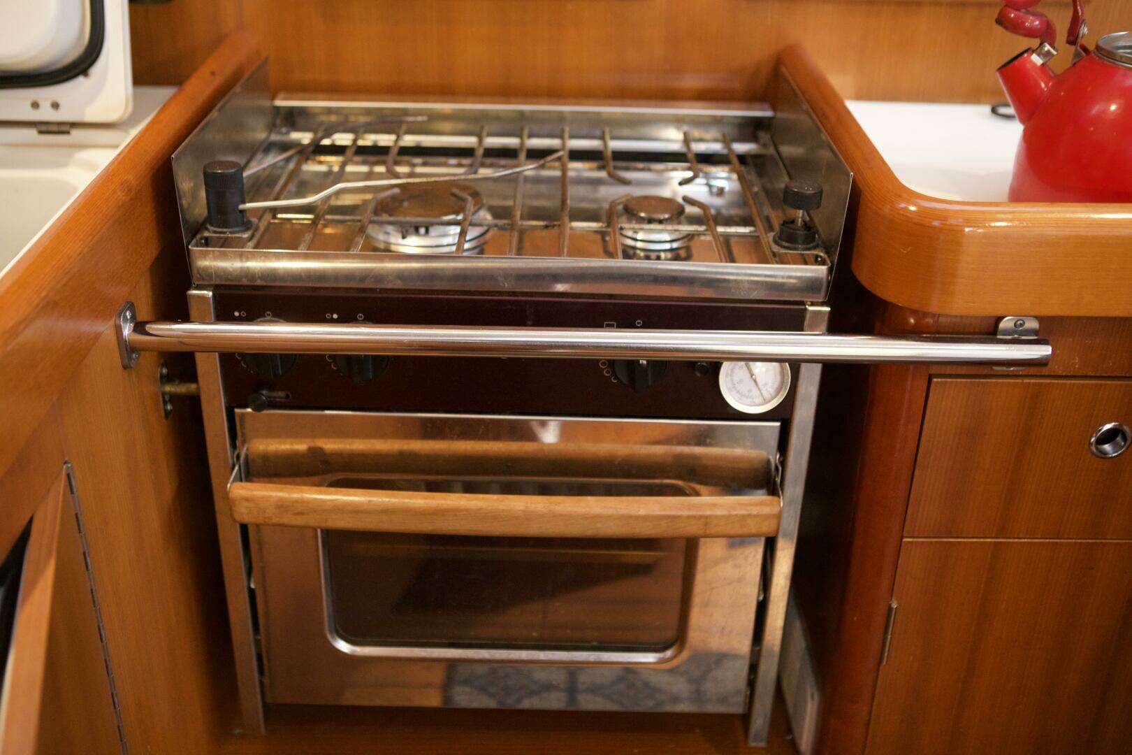 Below, the galley to port includes a dual-access refrigerator, microwave, and a functional propane stove/oven. To starboard, the aft head with shower leads to a spacious aft cabin with an athwartships berth, opening hatches, and good storage.