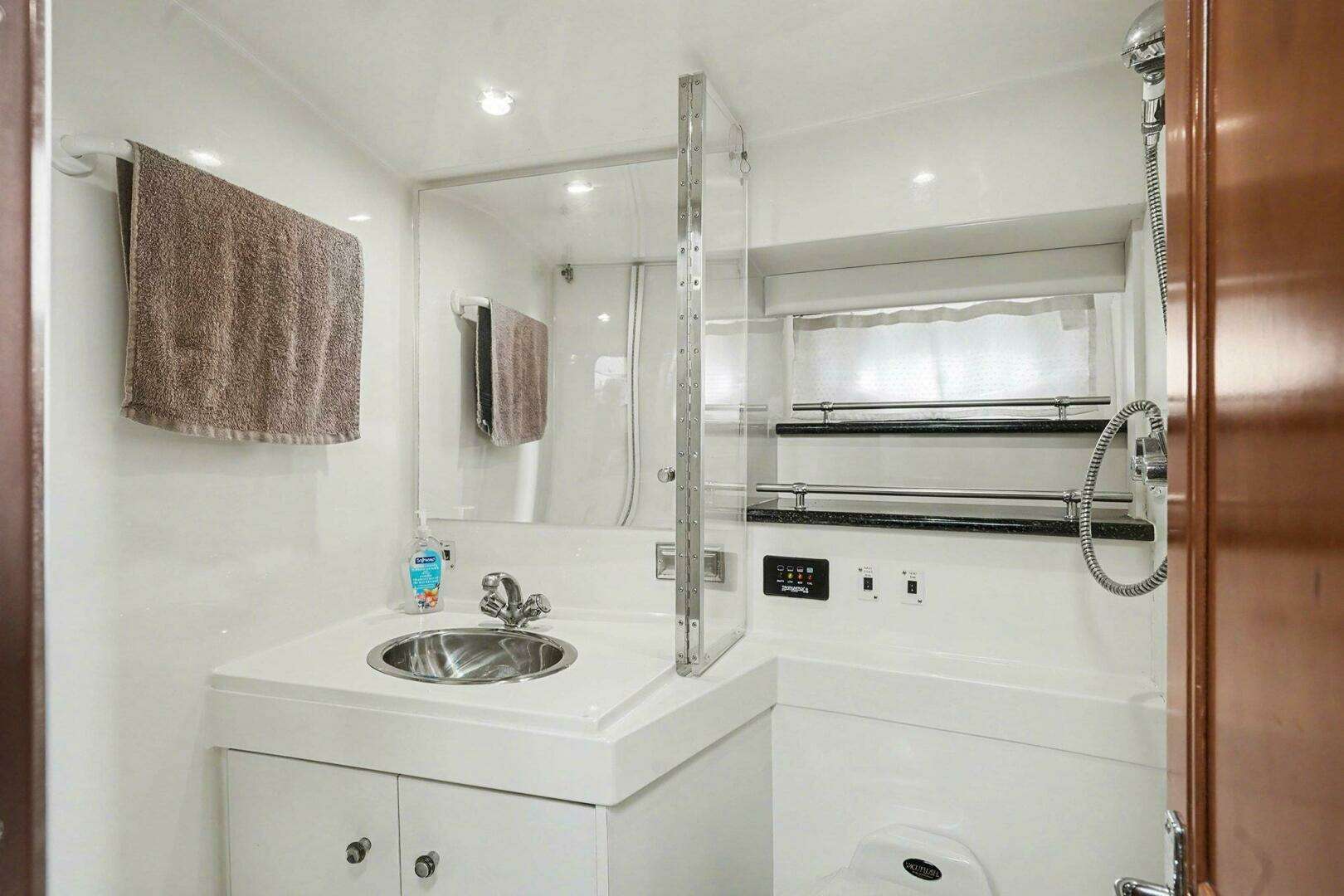 The private aft cabin creates a true owner’s retreat, while the open salon and well-appointed galley make entertaining or relaxing aboard feel natural and unconfined. Large windows throughout bring in abundant natural light, giving the interior a bright, welcoming feel whether you’re dockside or underway.
