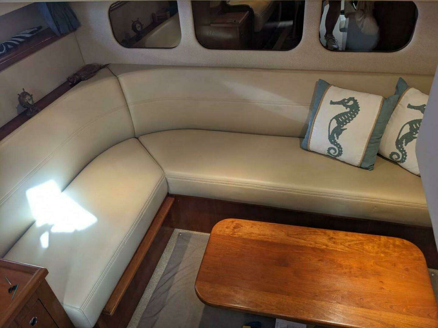 She has a centerline queen berth in the bow. The head with shower is to port. The galley is to port and a settee is to starboard. There is an aft seating area with a second head.