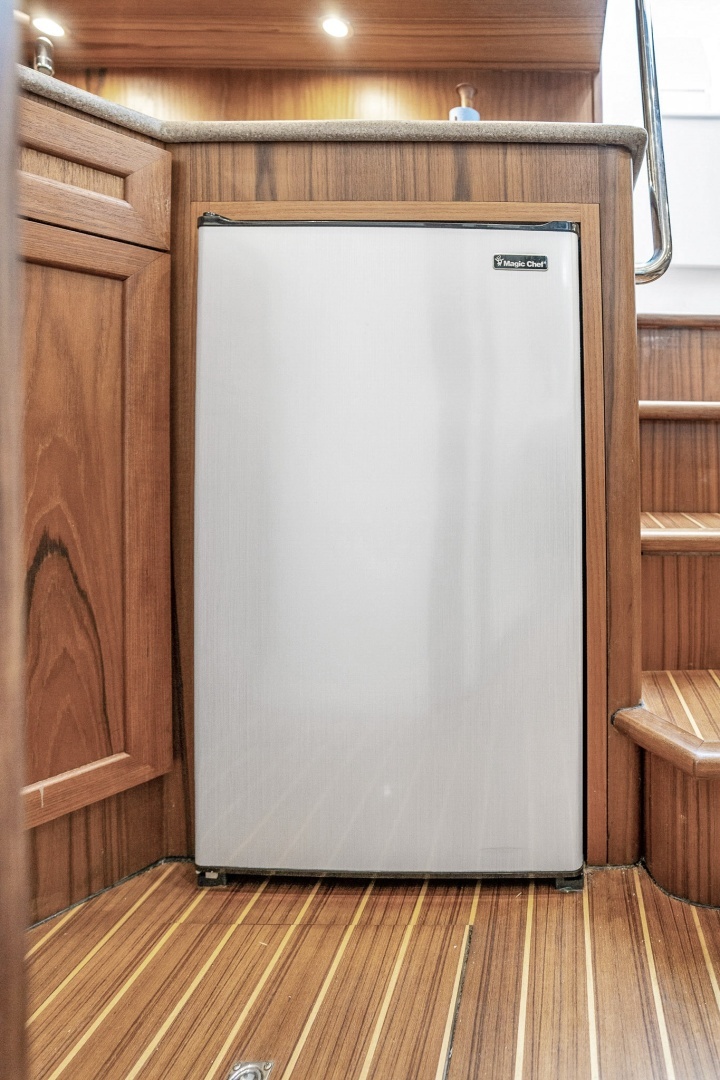 Aft is the galley settee and enclosed head. The settee is to port. The settee has a U-shaped upholstered lounge with varnished teak table. Outboard are rod storage racks. Aft is the main AC and DC electrical switchboard. The galley has a Corian countertop with stainless steel mounted sink and faucet with upper and lower finished wood cabinetry. Also in the galley is a Commercial Chef microwave oven and a Magic Chef refrigerator/freezer. Starboard side entered via a sliding pocket door is the enclosed head. The enclosed head has a Corian countertop vanity with stainless steel sink, mirrored medicine cabinets, a Raritan electric toilet, and a standup shower with Plexiglas paneled door.