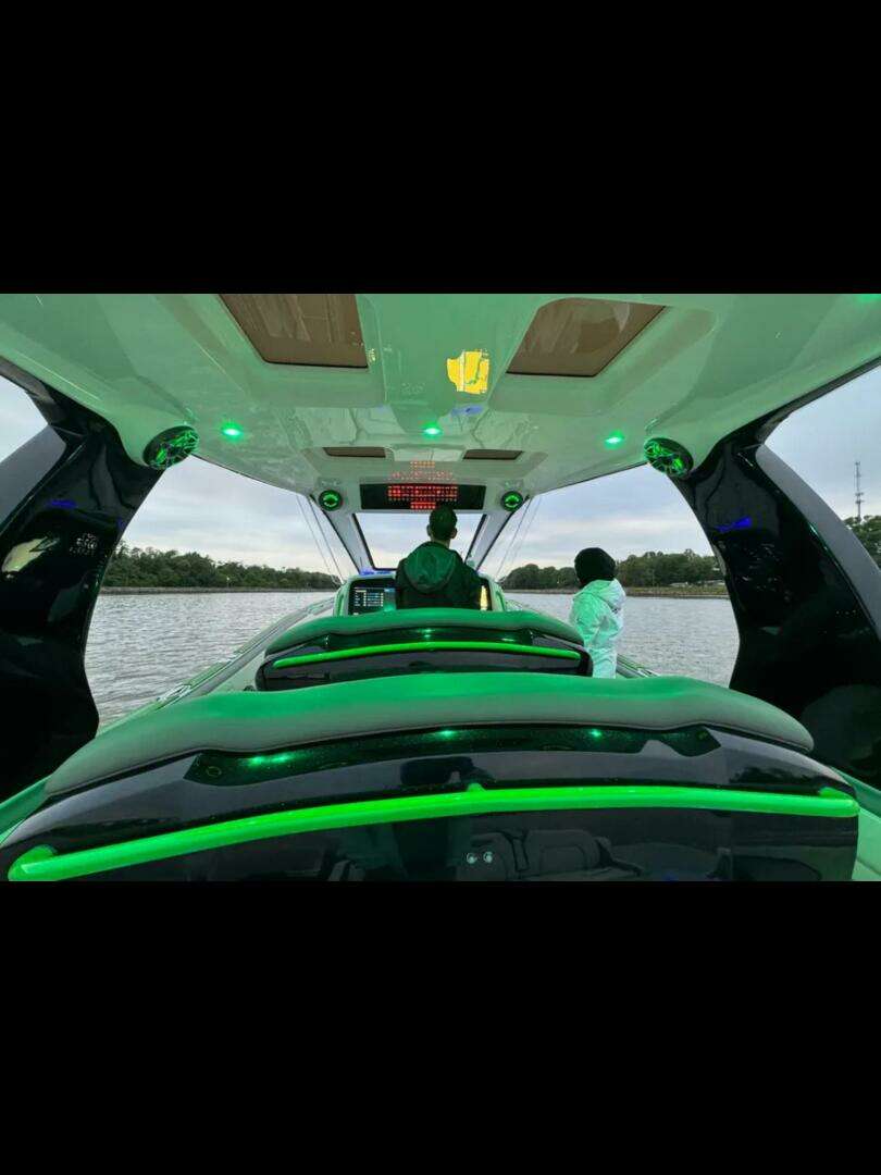 Built for both speed and comfort, she features dual row seating, full anti-fatigue flooring, bow thruster, windlass with 300’ rode, summer kitchen with slide-out Yeti cooler, sub-cooler with fridge, recessed hardtop shower, and extensive storage throughout. At the helm, twin 17” Garmin 8617 displays, twin 10” Garmin screens, 1kW transducer with GSD 25 sounder, Mercury VesselView, and full Shadow-Caster lighting provide cutting edge control. Upgraded JL Audio with 14 speakers, 4 subs, and 3 amps, plus underwater lights and Lumitec light bar, complete this under-$1M quad 500R statement boat.
